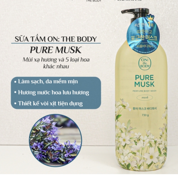 Sữa tắm On The Body Perfume Body Wash Pure Musk 730g là một sản phẩm sữa tắm cao cấp từ Hàn Quốc, thuộc dòng "Perfume Body Wash" của thương hiệu On The Body, nổi bật với khả năng lưu hương như nước hoa và cung cấp độ ẩm vượt trội.