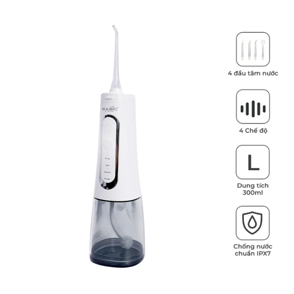 Tăm nước Magic Pro 80 1500mAh là thiết bị chăm sóc răng miệng cao cấp giúp loại bỏ mảng bám, vụn thức ăn và vi khuẩn ở các kẽ răng, đặc biệt thích hợp với người niềng răng, implant hoặc những vị trí răng khó tiếp cận. Sản phẩm mang lại hiệu quả vệ sinh sâu hơn so với bàn chải thông thường, đồng thời giúp nướu khỏe mạnh và hơi thở thơm mát.