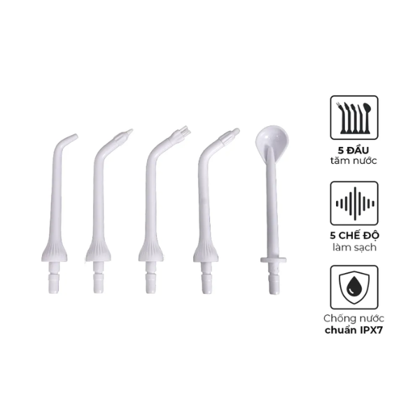 Máy trang bị 5 đầu tăm xoay linh hoạt, giúp vệ sinh toàn bộ khoang miệng, tiếp cận các kẽ răng và nướu hiệu quả. Người dùng có thể thay đổi đầu tăm phù hợp với từng mục đích sử dụng như răng thường, răng niềng, vệ sinh nướu hoặc massage nhẹ nhàng. Thiết kế đầu tăm an toàn, tránh gây tổn thương niêm mạc và răng nhạy cảm.