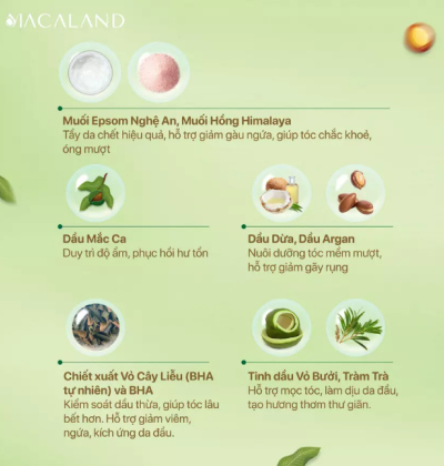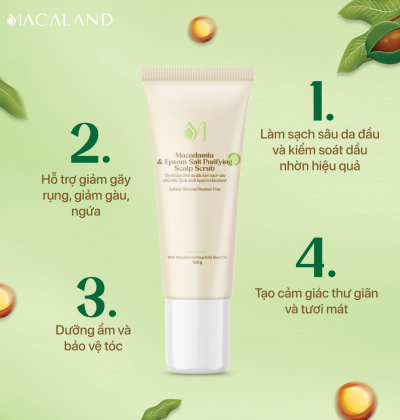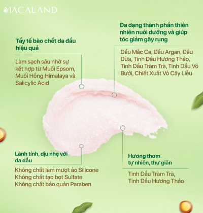Với hàm lượng cao Dầu Mắc Ca có khả năng dưỡng ẩm và phục hồi hư tổn, cùng Muối Epsom giúp tẩy da đầu hiệu quả, hỗ trợ giảm gàu ngứa, kích ứng, Macaland hy vọng Tẩy tế bào chết da đầu sẽ mang đến một sản phẩm chất lượng đến với người tiêu dùng, đồng thời lan toả sứ mệnh tận dụng tối đa nguồn nguyên liệu thiên nhiên một cách bền vững.![]()
