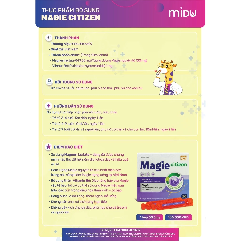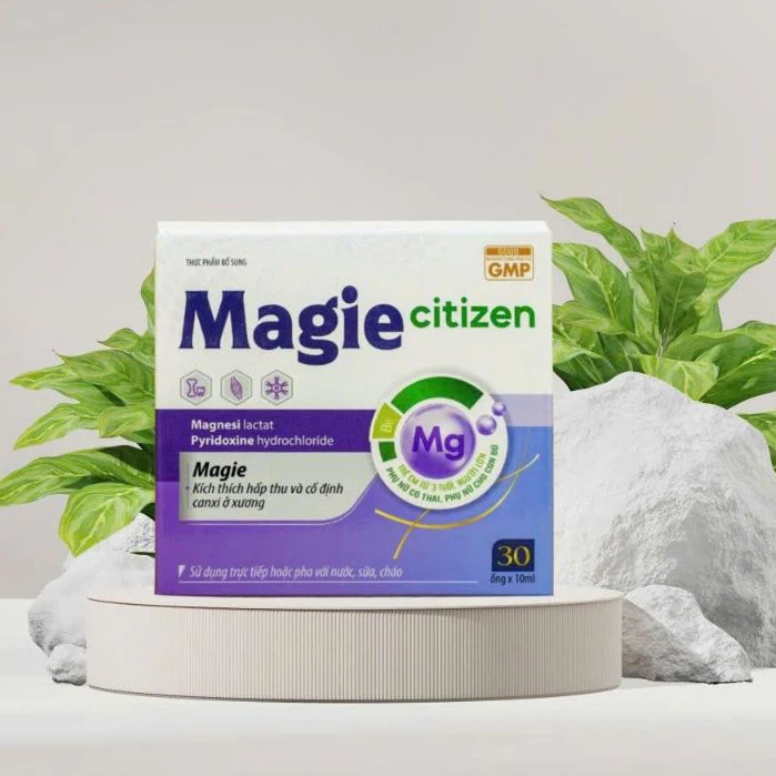 Magie Citizen là dòng thực phẩm bổ sung thiết yếu giúp bổ sung 100mg Magie nguyên tố cùng Vitamin B6 trong mỗi ống, hỗ trợ giảm mệt mỏi, căng thẳng và chuột rút hiệu quả. Sản phẩm có hương dâu dễ uống, phù hợp cho cả trẻ từ 3 tuổi, người lớn, phụ nữ mang thai và cho con bú. Đặc biệt Magie Citizen giúp kích thích hấp thu và cố định Canxi ở xương, hỗ trở trẻ tăng chiều cao hiệu quả.