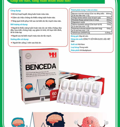 BENCEDA được sản xuất bởi Công ty Cổ phần Dược Liệu Việt Nam và phân phối bởi VH Medipharm & Brainnus. Sản phẩm có công dụng chính là hỗ trợ hoạt huyết, tăng tuần hoàn máu lên não, cải thiện trí nhớ và giảm căng thẳng.![]()