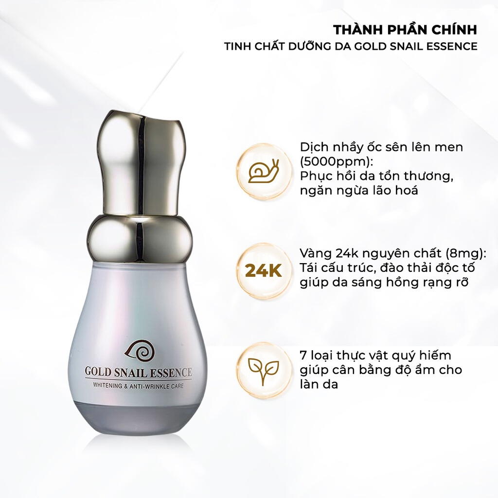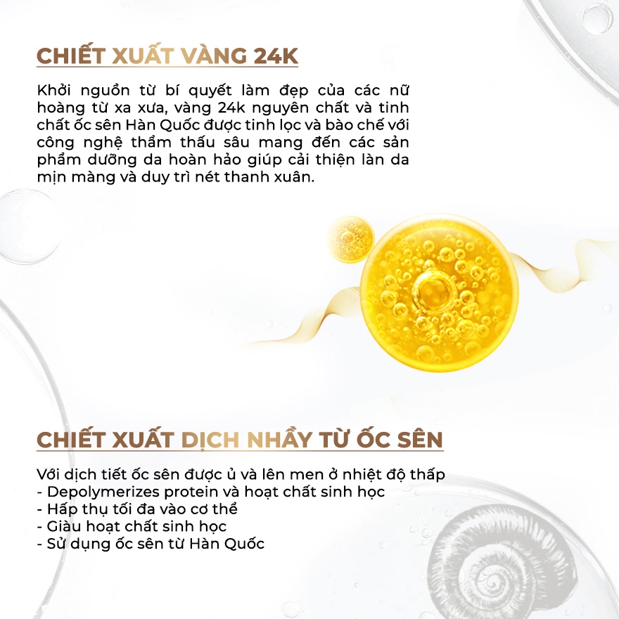 - Chiết xuất Vàng 24K (chứa 8mg) và dịch nhầy từ ốc sên (5.000ppm) cùng 7 loại thực vật quý hiếm giúp cân bằng độ ẩm cho da (rễ sâm, cam thảo, tía tô ...