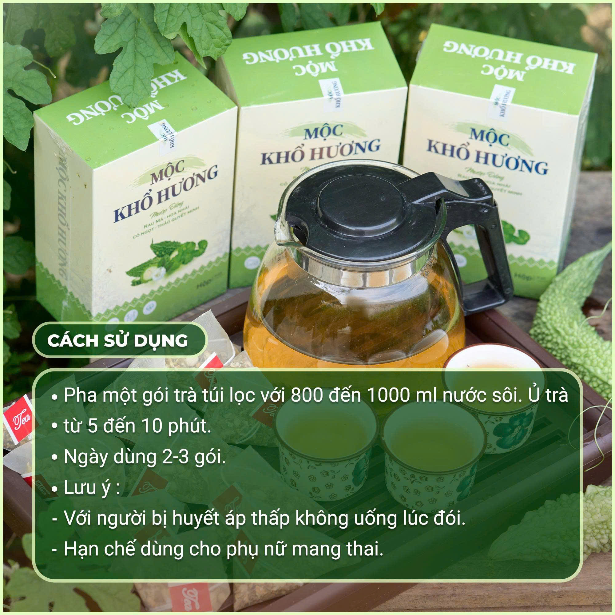 Tên sản phẩm: Trà Mộc Khổ Hương Quy cách đóng gói: [bổ sung thực tế, ví dụ: hộp 20 gói hoặc túi trà khô 100g] Hạn sử dụng: 18 – 24 tháng kể từ ngày sản xuất Xuất xứ: [bổ sung thông tin thực tế trên bao bì] Nhà sản xuất/Phân phối: [ghi chi tiết theo đơn vị cung cấp]