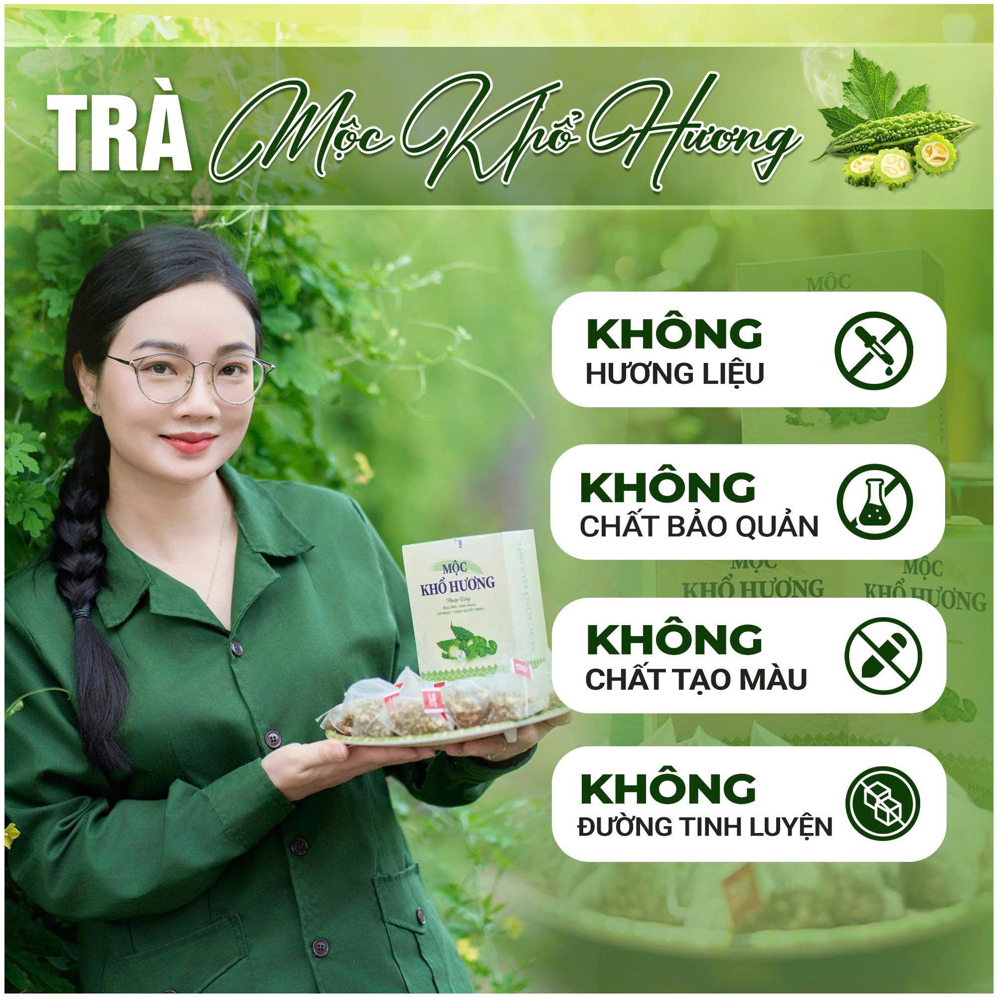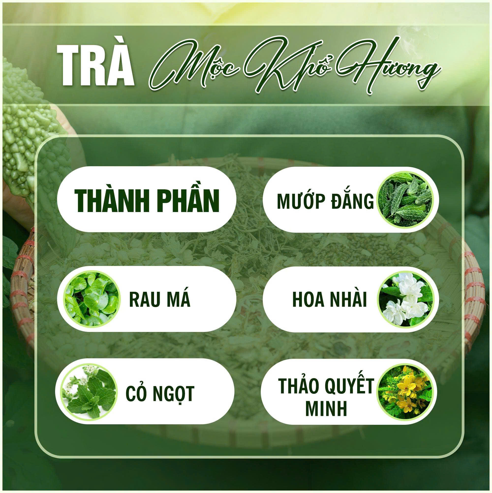 Trà Mộc Khổ Hương được chiết xuất từ nhiều loại thảo mộc thiên nhiên, an toàn và có giá trị dược liệu cao. Nguyên liệu chính là lá khổ qua và các loại thảo mộc phối hợp khác, giúp mang đến hương vị đặc trưng cùng công dụng vượt trội. Khổ qua được biết đến là loại thảo mộc giàu dưỡng chất, có tác dụng thanh nhiệt, giải độc, hỗ trợ đường huyết và tốt cho gan. Ngoài ra, sản phẩm còn kết hợp với các loại thảo mộc hỗ trợ tiêu hóa, giúp giảm đầy bụng, khó tiêu và làm dịu dạ dày.