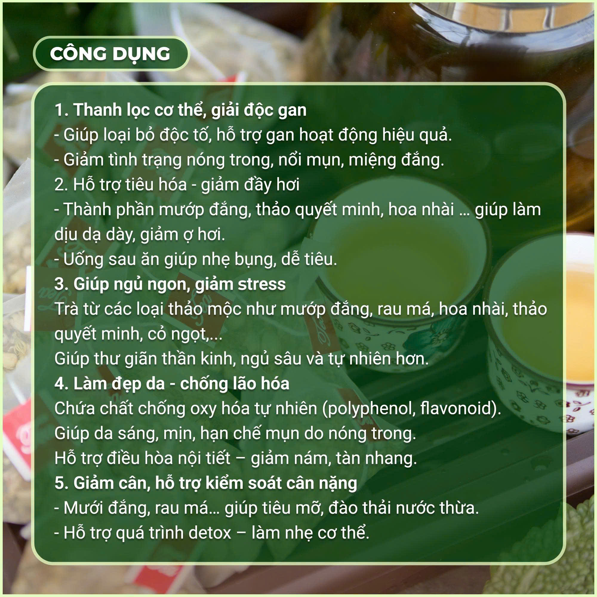 Sản phẩm còn có tác dụng hỗ trợ tiêu hóa, giúp giảm tình trạng đầy hơi, khó tiêu, đồng thời kích thích hệ tiêu hóa hoạt động hiệu quả hơn. Với những người thường xuyên mất ngủ hoặc hay căng thẳng, trà cũng giúp làm dịu tinh thần, mang lại giấc ngủ sâu và thư giãn. Ngoài ra, Trà Mộc Khổ Hương còn được xem là một phương pháp hỗ trợ kiểm soát cân nặng nhờ khả năng điều hòa chuyển hóa và loại bỏ độc tố tích tụ trong cơ thể.![]()