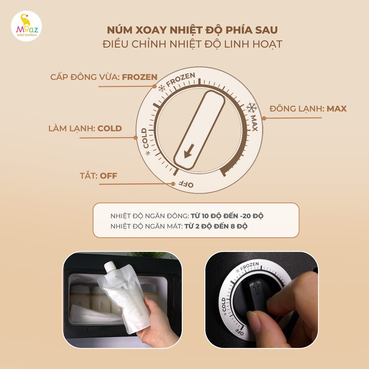 Núm xoay điều chỉnh nhiệt độ phía sau (COLD: làm lạnh, FROZEN: cấp đông vừa, MAX: đông lạnh)
