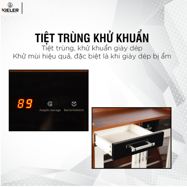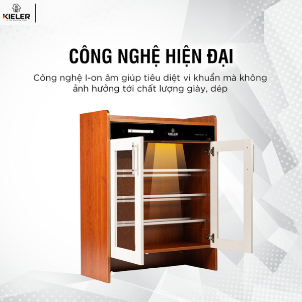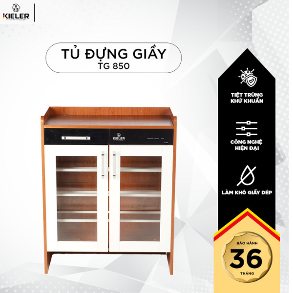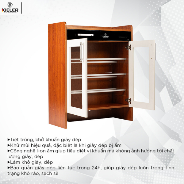 Tủ giày tiệt trùng Kieler KL-TG 850 được áp dụng công nghệ ion âm sẽ giúp tiêu diệt vi khuẩn hiệu quả mà không ảnh hưởng tới chất lượng giày, dép.