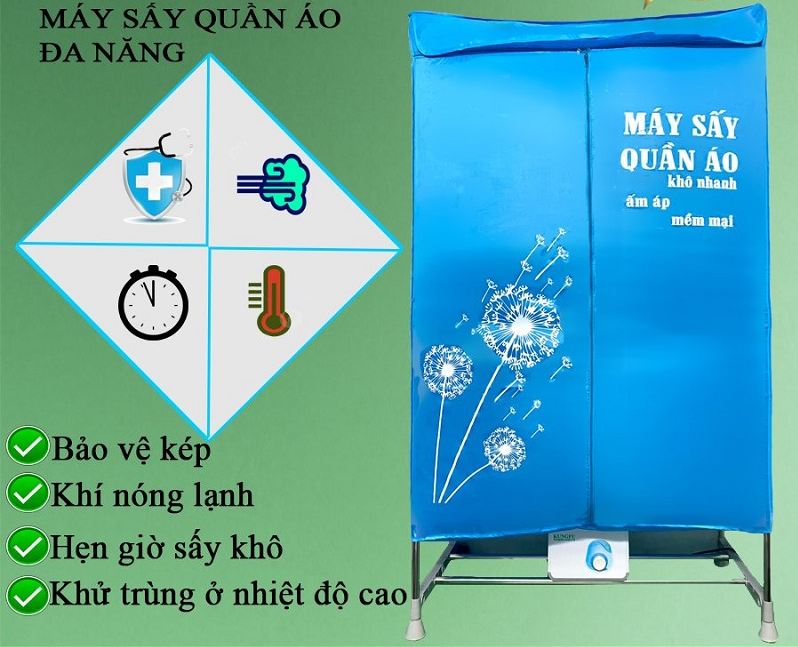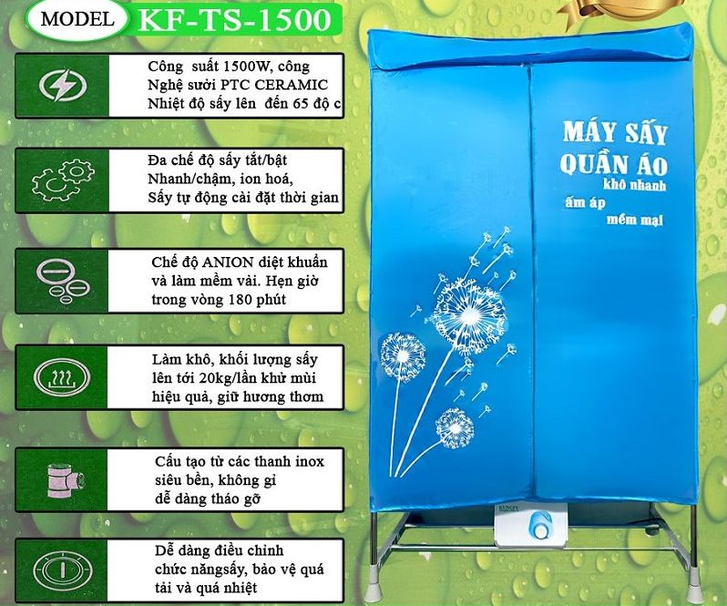 Công suất máy 1500w ,So với thị trường máy được trang bị những công nghệ sưởi PTC Ceramic nổi bật giúp cho quần áo chúng ta có thể khô nhanh và diệt khuẩn lên đến 99% .Nhiệt độ sấy lên đến 65 độ c.