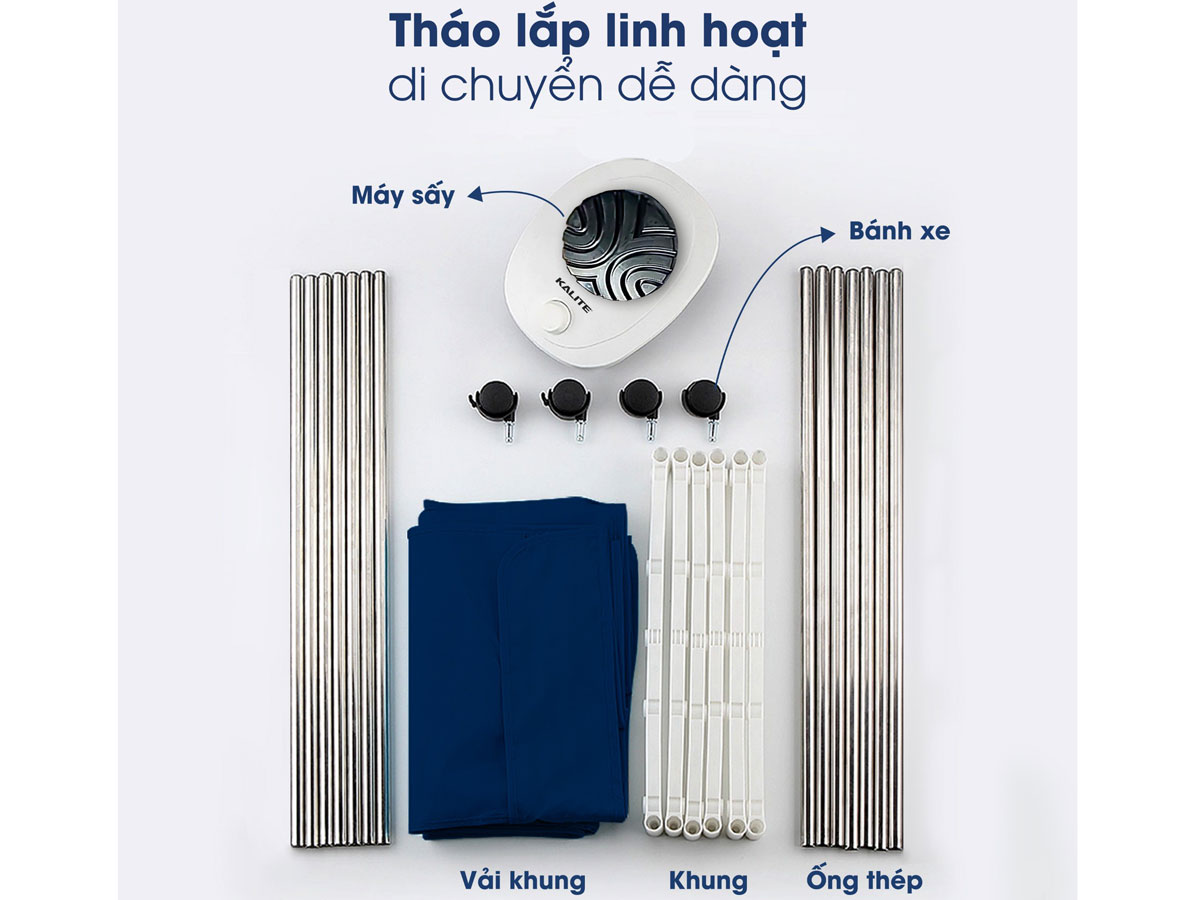 Các bộ phận của máy sấy quần áo Kalite KL6880 có thể tháo lắp dễ dàng linh hoạt. Khi không cần dùng có thể gấp gọn cất đi tiện lợi.