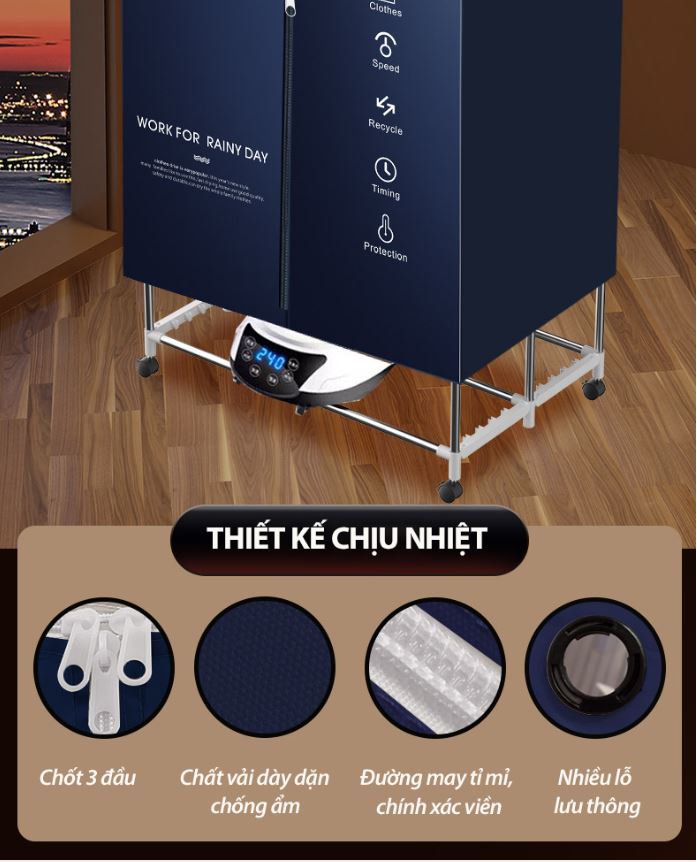 Máy Sấy Quần Áo có thiết kế đẹp mắt với lớp vải bọc chất liệu chống nước siêu bền, chịu được nhiệt độ cao, tăng độ bền bỉ cho sản phẩm. Khung máy sấy có thể gấp gọn gàng và di chuyển dễ dàng, giúp tối ưu diện tích, không gian cho căn phòng của bạn.