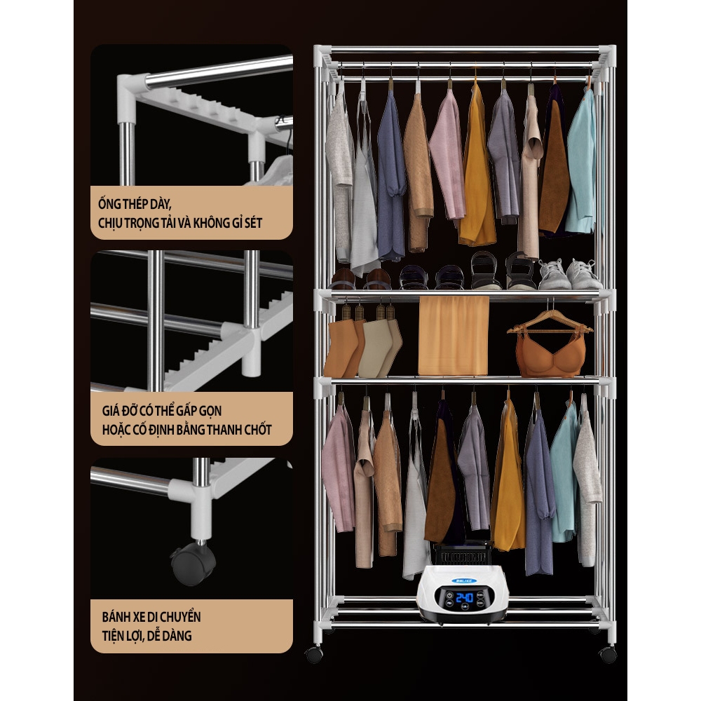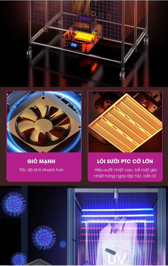 Với bộ phát nhiệt ổn định PTC, quần áo của bạn không chỉ được sấy khô nhanh mà còn chống nhăn, đảm bảo chất lượng và màu sắc của vải. Ngoài ra, sản phẩm còn được thiết kế dạng giá treo đứng, tiết kiệm diện tích, rất thích hợp với những gia đình sống ở khu tập thể hay chung cư hạn hẹp không có không gian phơi đồ.