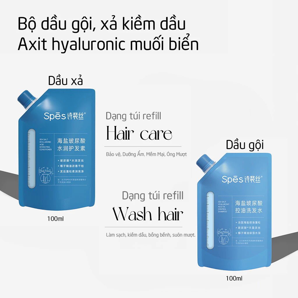 Túi Dầu Gội & Dầu Xả Kiềm Dầu SPES với Axit Hyaluronic và muối biển là giải pháp hiệu quả cho mái tóc bồng bềnh, sạch thoáng. Sản phẩm giúp làm sạch sâu da đầu, loại bỏ bã nhờn, đồng thời tăng độ phồng và làm dày tóc. Công thức đặc biệt mang lại mái tóc suôn mượt, chắc khỏe tự nhiên. Dung tích 100ml dạng túi tiện lợi, dễ dàng mang theo bên mình mọi lúc mọi nơi.