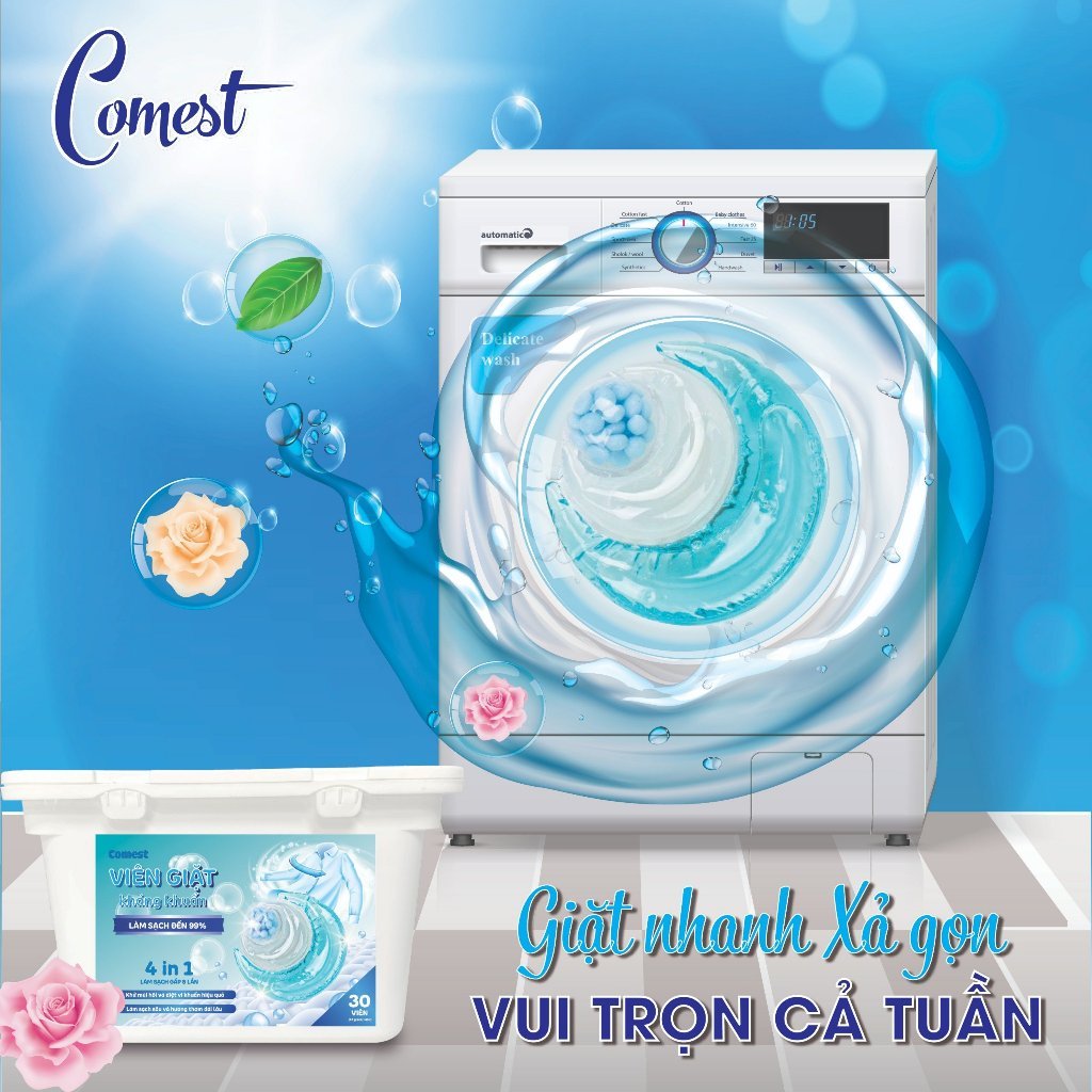 - Comest là sản phẩm tiên phong trong công nghệ kết hợp hài hòa 2 sức mạnh Giặt & Xả trong 1 viên giặt xả tiện lợi, với quy trình sử dụng đơn giản, nhanh gọn chỉ trong 1 bước, 1 giây mà không cần phải đong đo lượng sản phẩm, mang lại hiệu quả tối đa chỉ trong 1 bước.