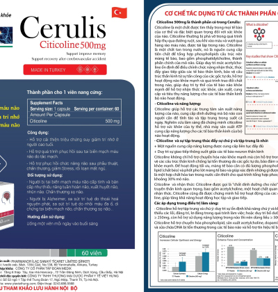 Điểm nổi bật của Cerulis nằm ở thành phần chính Citicoline. Đây là một hoạt chất sinh học tự nhiên, có vai trò quan trọng trong việc tổng hợp phospholipid, đặc biệt là phosphatidylcholine, một thành phần cấu tạo nên màng tế bào thần kinh. Citicoline cung cấp choline và cytidine, hai chất dinh dưỡng thiết yếu giúp tăng cường chức năng não bộ, bao gồm học hỏi, ghi nhớ và tư duy.