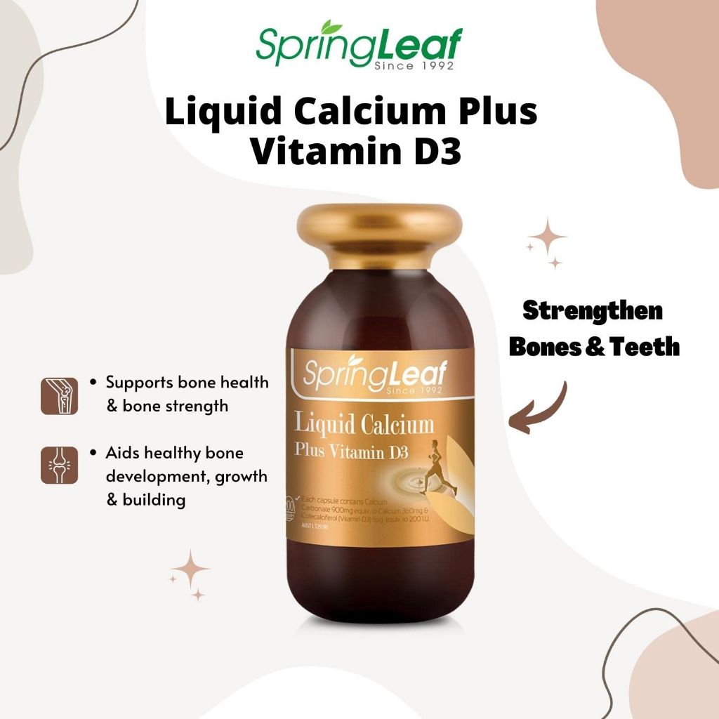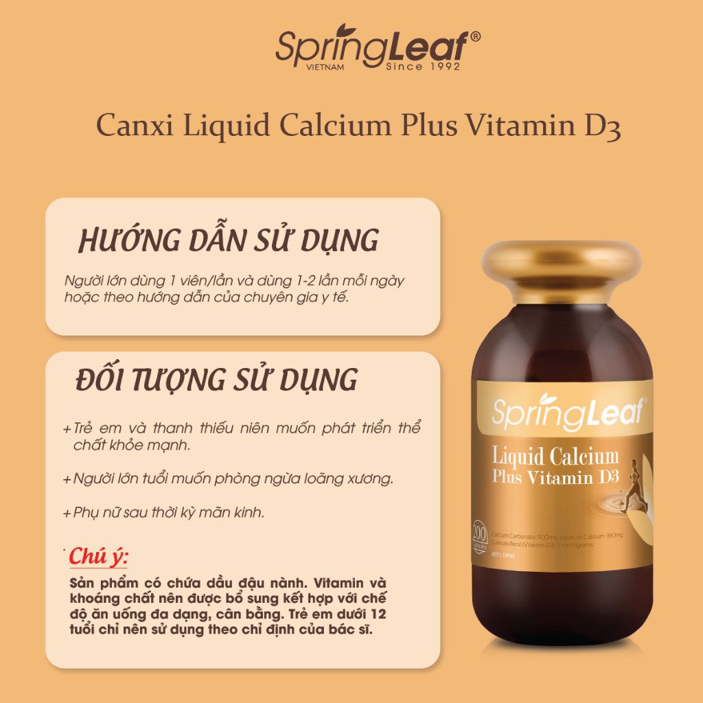 Với mỗi viên nang mềm SpringLeaf giúp cung cấp canxi ở dạng lỏng dễ hấp thụ, đồng thời bổ sung thêm vitamin D3 tạo điều kiện để cơ thể hấp thụ canxi tối ưu.