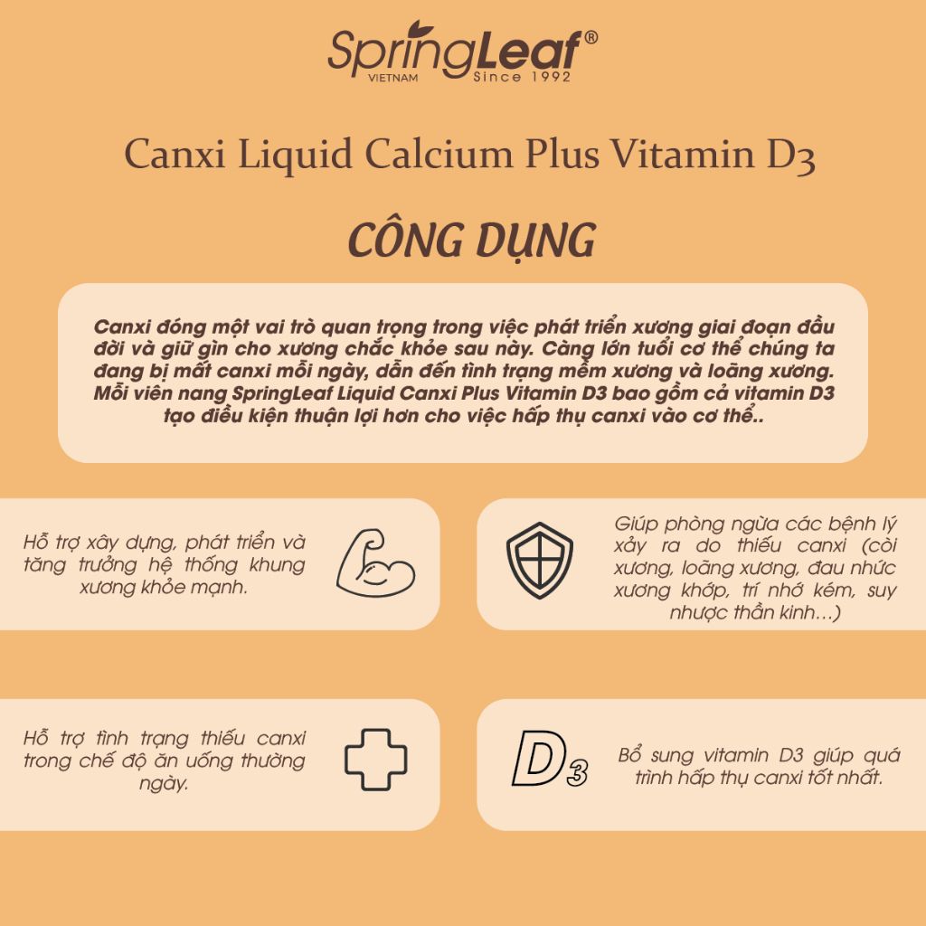 Viên uống bổ sung canxi SpringLeaf Liquid Calcium Plus Vitamin D3 - Hộp 60 viên, Date mới nhất