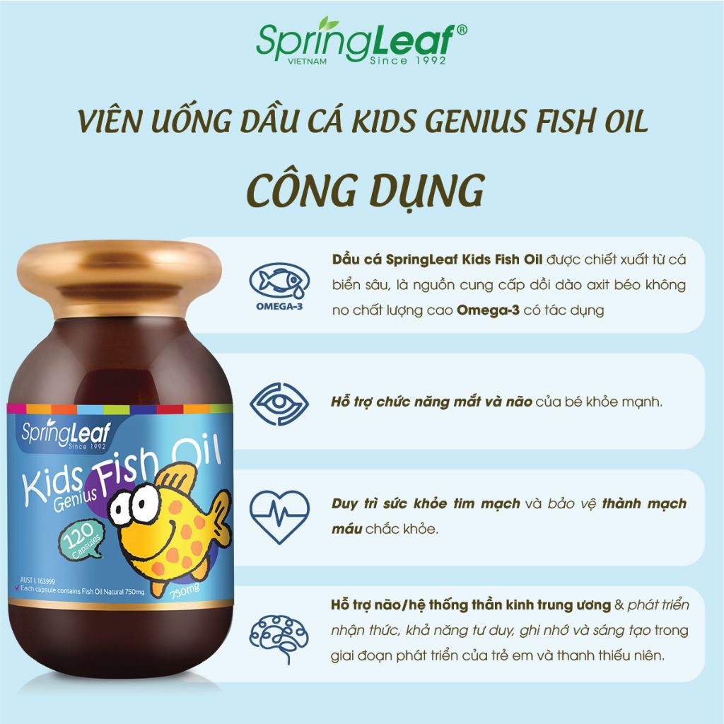 Dầu cá dành cho trẻ em của SpringLeaf được chiết xuất từ cá biển sâu, là nguồn cung cấp dồi dào axit béo không no chất lượng cao – omega 3. SpringLeaf Kids Genius Fish Oil có chứa 2 loại omega 3: axit eicosapentaenoic (EPA) và axit docosahexaenoic (DHA). Là các axit có vai trò quan trọng trong quá trình chuyển hóa, DHA và EPA giúp duy trì, hỗ trợ phát triển trí tuệ và thị lực, thúc đẩy phát triển chất dẫn truyền thần kinh ở trẻ em.