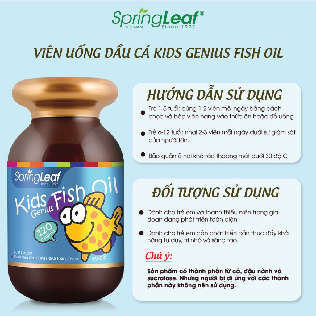 SpringLeaf Fish Oil được thiết kế cho trẻ em không thêm đường, có dạng viên nang hình con cá ngộ nghĩnh với hương vị cam dễ chịu. Sản phẩm thơm ngon, thích hợp với trẻ em và thanh thiếu niên – nhất là với những trẻ không thích ăn cá hoặc sống ở những vùng địa lý xa biển.