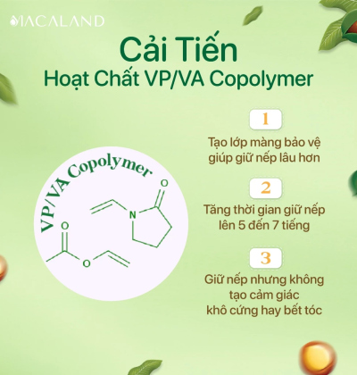 - Hoạt chất VP/VA Copolymer tạo lớp màng bảo vệ giúp giữ nếp lâu hơn mà không gây cảm giác khô, cứng tóc