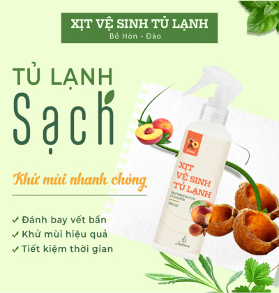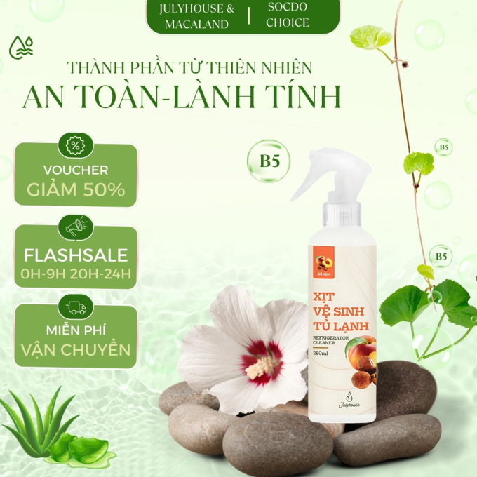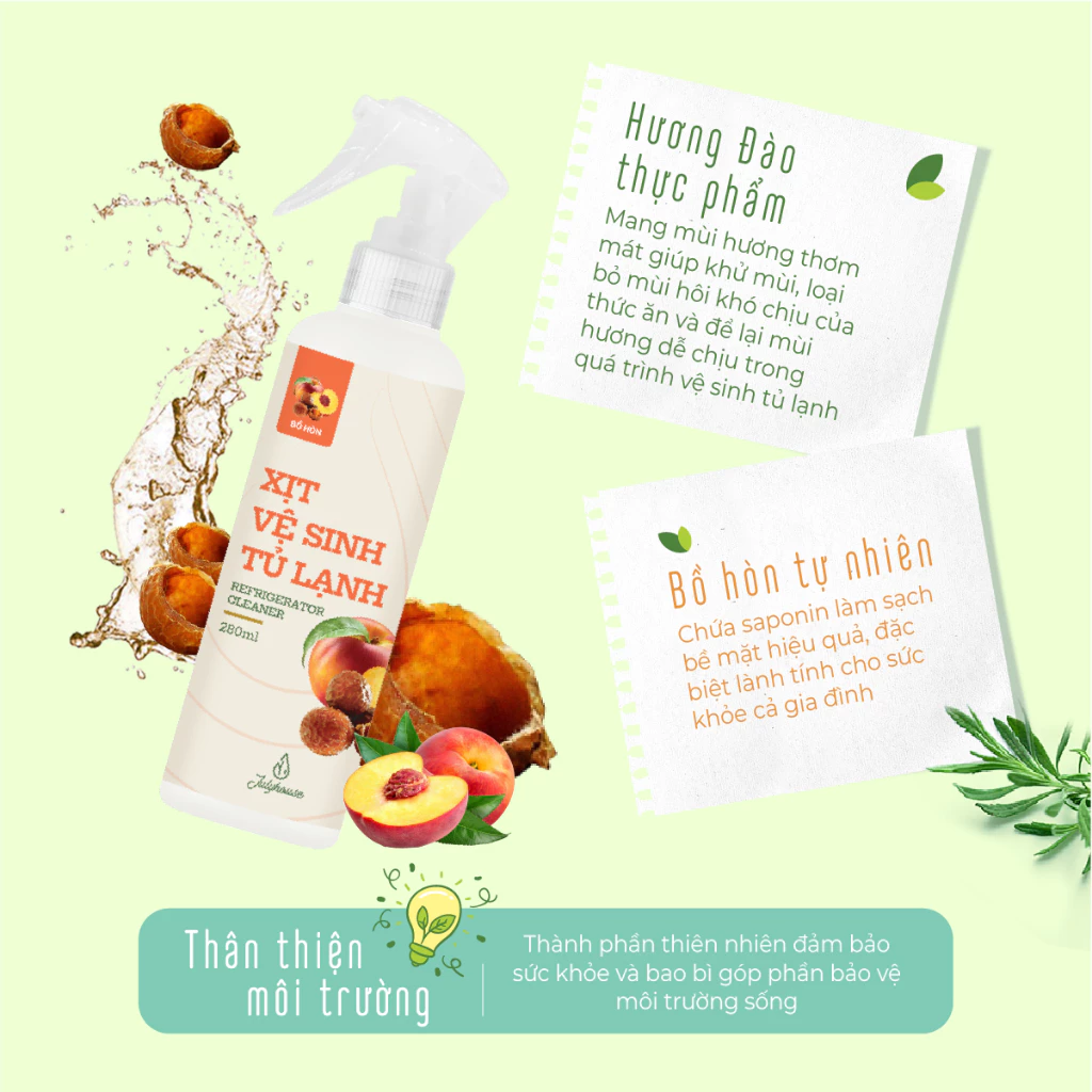 - Xịt vệ sinh tủ lạnh JULYHOUSE với chiết xuất Bồ Hòn tự nhiên giúp làm sạch cả bề mặt bên trong và bên ngoài tủ lạnh. Chai dạng xịt tiện dụng, tiết kiệm, sử dụng đơn giản, dễ dàng vệ sinh tủ lạnh một cách nhanh chóng tiện lợi. Sản phẩm không chất tạo màu.