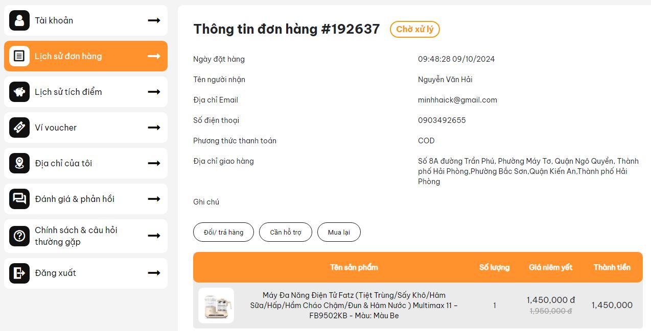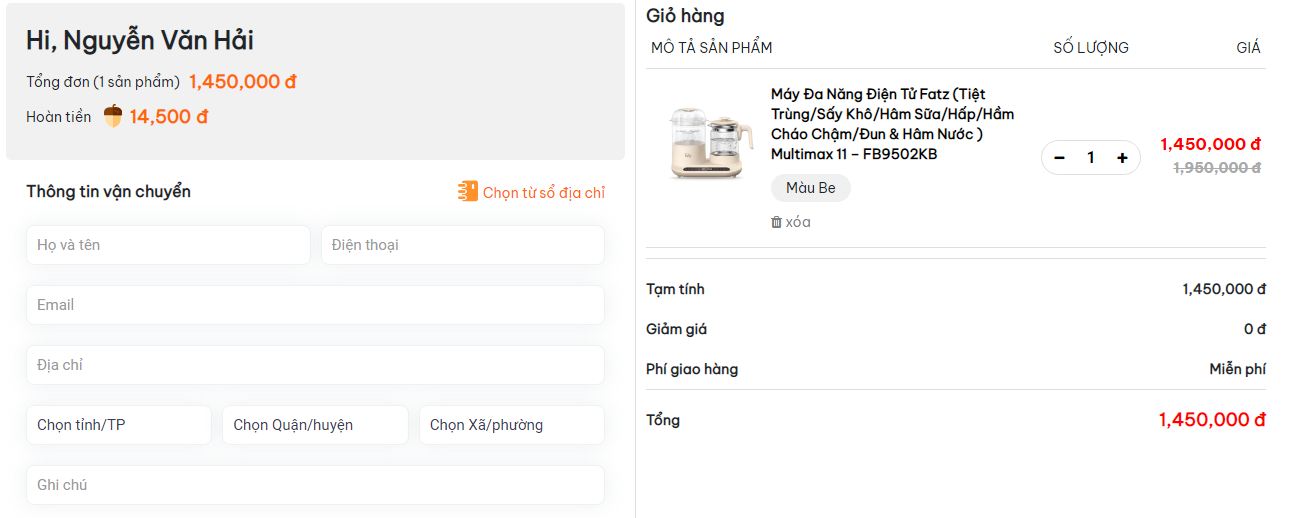 - Bước 2: Nhấn "thanh toán đơn hàng" , màn hình sẽ hiển thị thông tin nhận hàng của Khách hàng, vui lòng điền đẩy đủ và kiểm tra lại thông tin chính xác trước khi nhấn. Tiếp tục thanh toán đơn hàng.