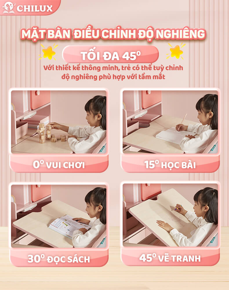 Mặt bàn học của các mẫu bàn học Chilux được thiết kế thông minh, từ đó bé có thể dễ dàng tự điều chỉnh góc nghiêng của mặt bàn từ 0 cho đến 50 độ. Điều này phù hợp với bé khi cần phải vẽ, hay những thao tác không nằm trên mặt phẳng của bàn.