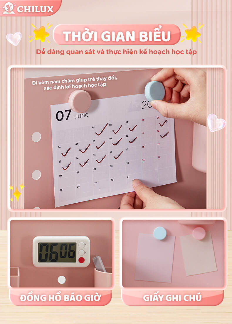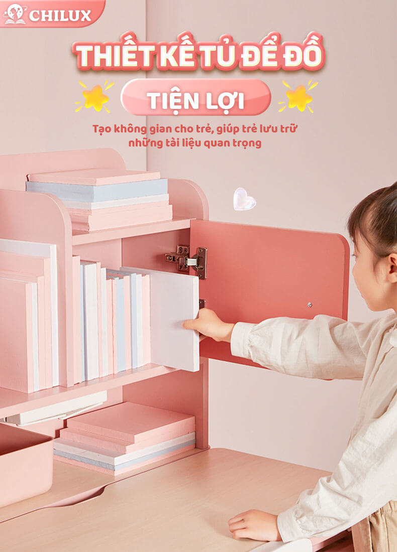 Việc chú trọng đầu tư vào các chi tiết nhỏ từ hộc bàn, tủ, kệ sách cho đến thiết kế của chân bàn, hộp đựng bút, đồng hồ đính kèm trên bàn học giúp sản phẩm có sự hài hòa về thiết kế. Hơn hết Chilux hướng đến bé bởi Chilux hiểu một điều thẩm mỹ tốt sẽ là một trong những cách tạo cảm hứng học tập cho trẻ, bé thích ngồi với góc học tập thân yêu của mình hơn.