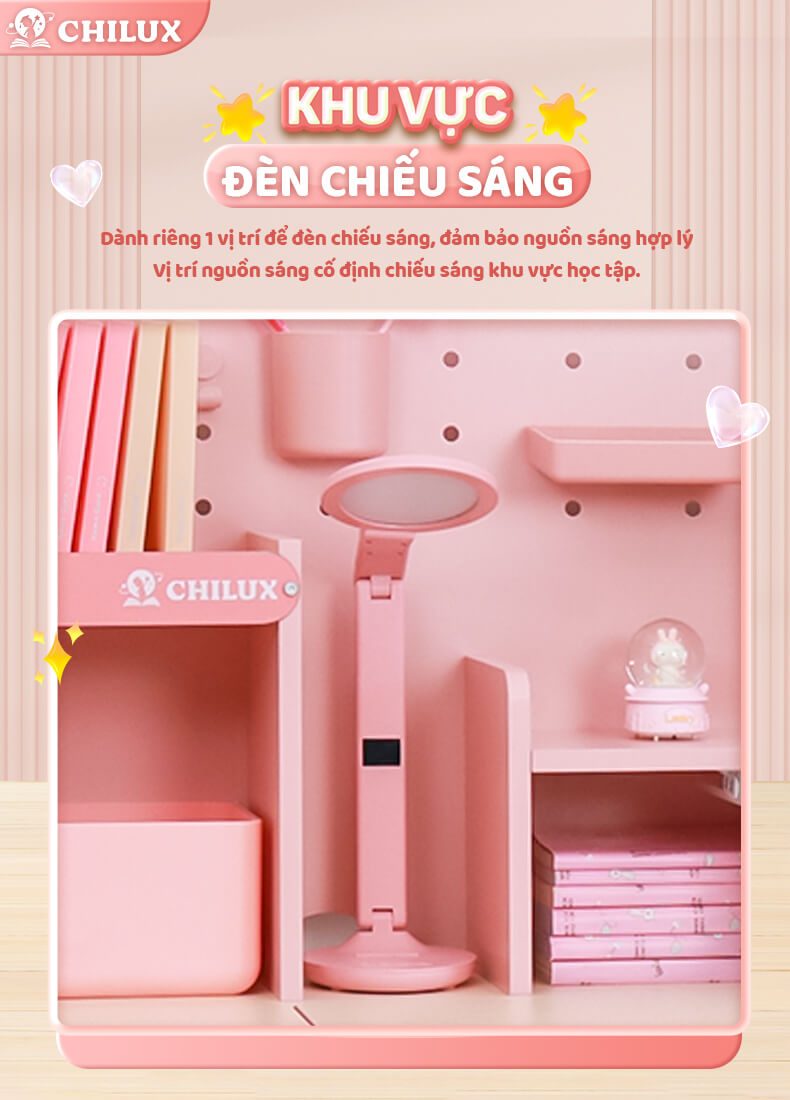 Đồng thời với các dụng cụ hỗ trợ là đèn học đủ tiêu chuẩn ánh sáng, thay đổi được cường độ sáng từ Chilux cũng là một vật dụng giúp bé hạn chế vấn đề này