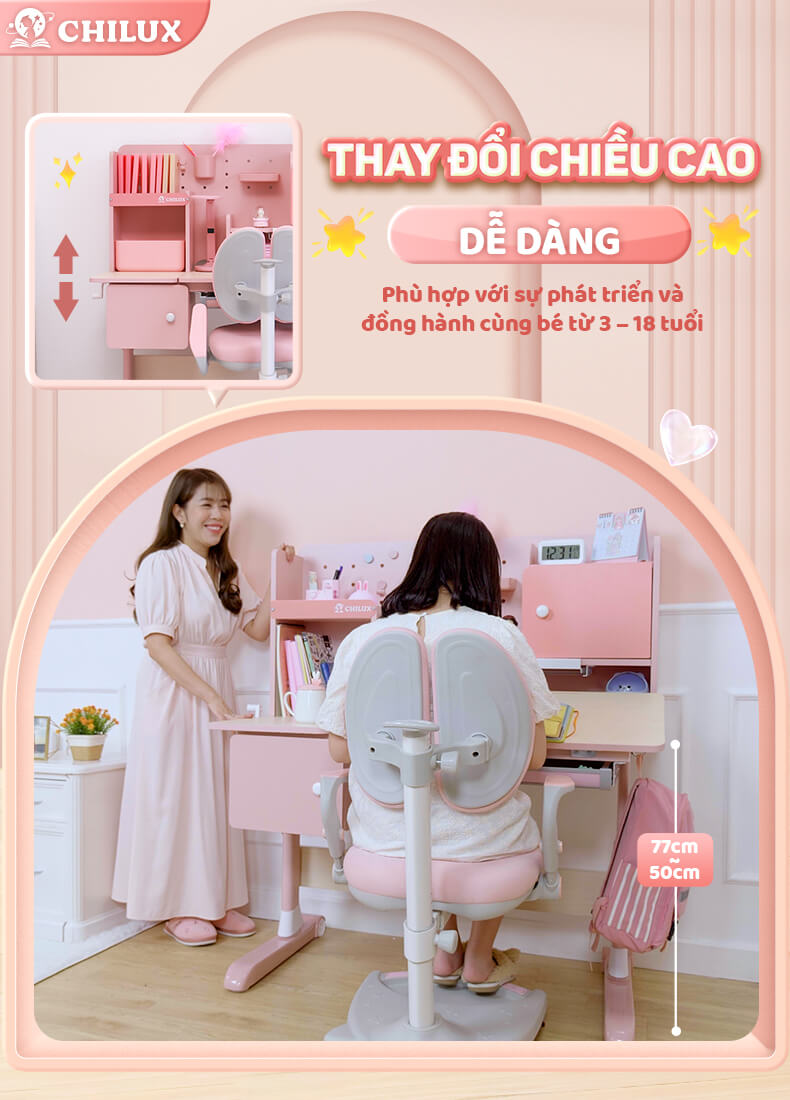 Cả 3 dòng bàn học của Chilux đểu có thể điều chỉnh được chiều cao của chân bàn, từ đó mặt bàn có chiều cao điều chỉnh được từ 53cm đến 77cm so với mặt đất. Kết hợp với ghế ngồi đúng tư thế cũng điều chỉnh từ 35-56cm sẽ giúp sản phẩm phù hợp với nhiều độ tuổi của bé khác nhau, giúp bé ngồi học đúng tư thế
