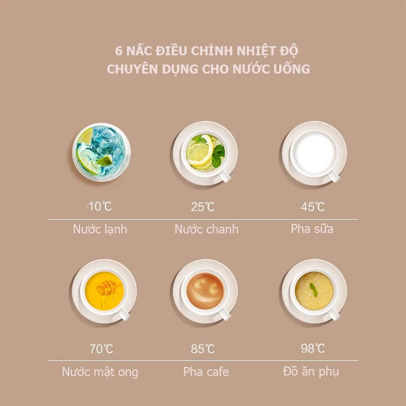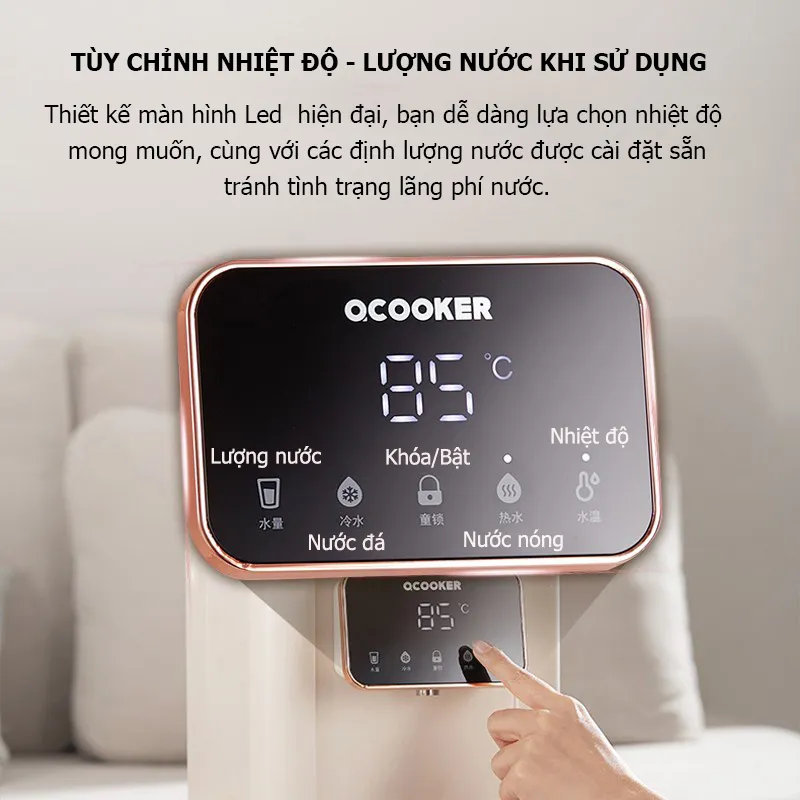 - Bình thủy điện Qcooker được tích hợp nhiều tính năng hiện đại như thời gian làm nóng nước nhanh gần như ngay lập tức, tùy chỉnh 6 mức nhiệt độ" 10°C, 25°C, 45°C 70°C,80°C,100°C phù hợp cho những nhu cầu sử dụng khác nhau