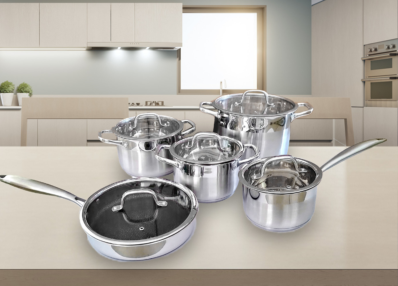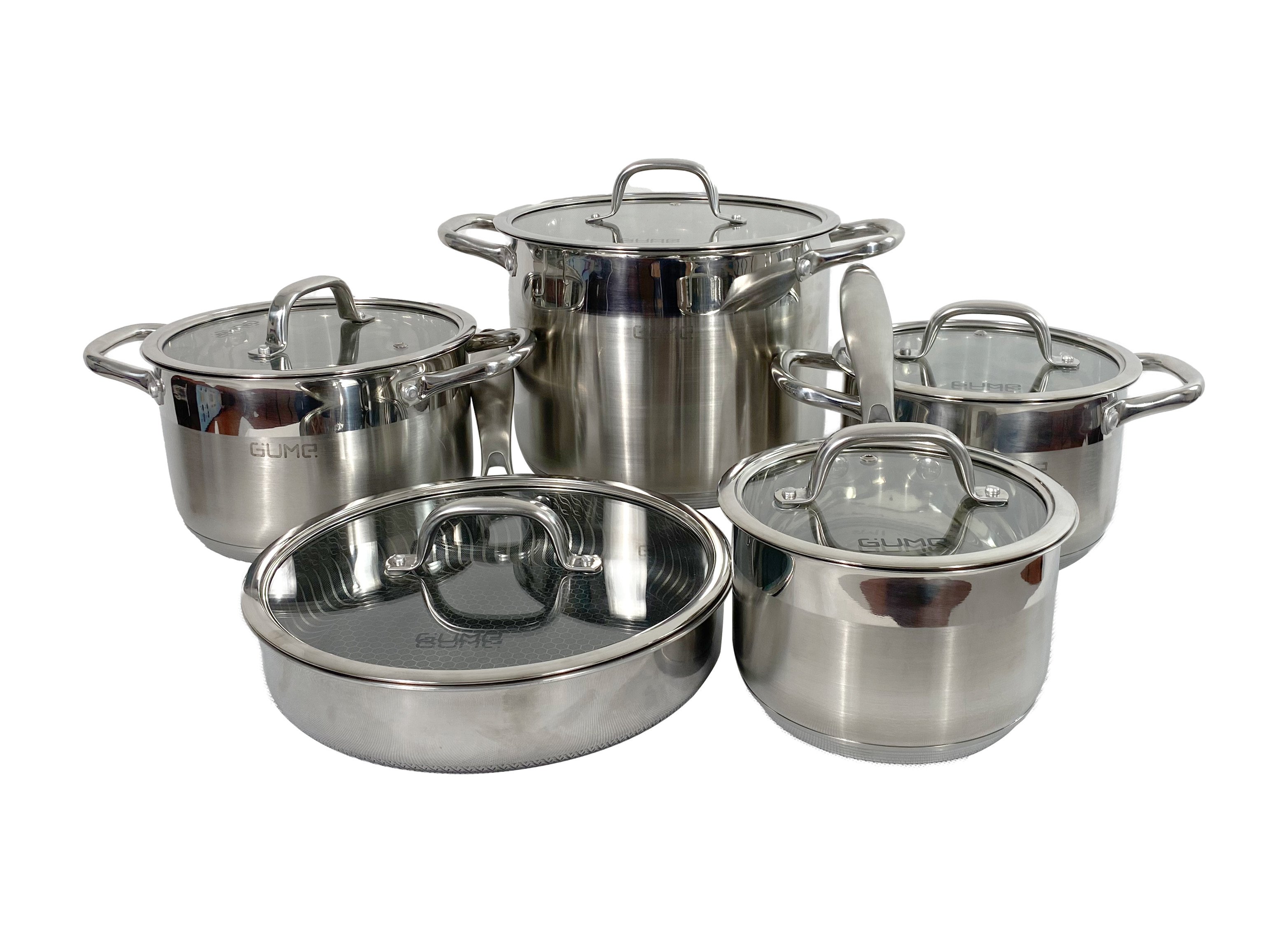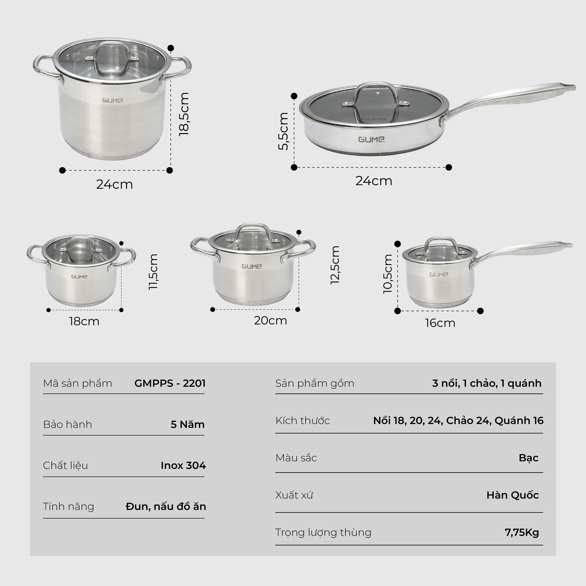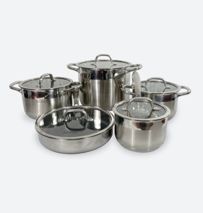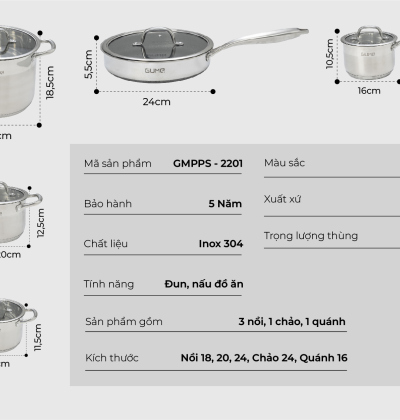 Bộ nồi bao gồm 5 sản phẩm có kích thước đa dạng: 3 nồi, 1 chảo sốt và 1 chảo rán .