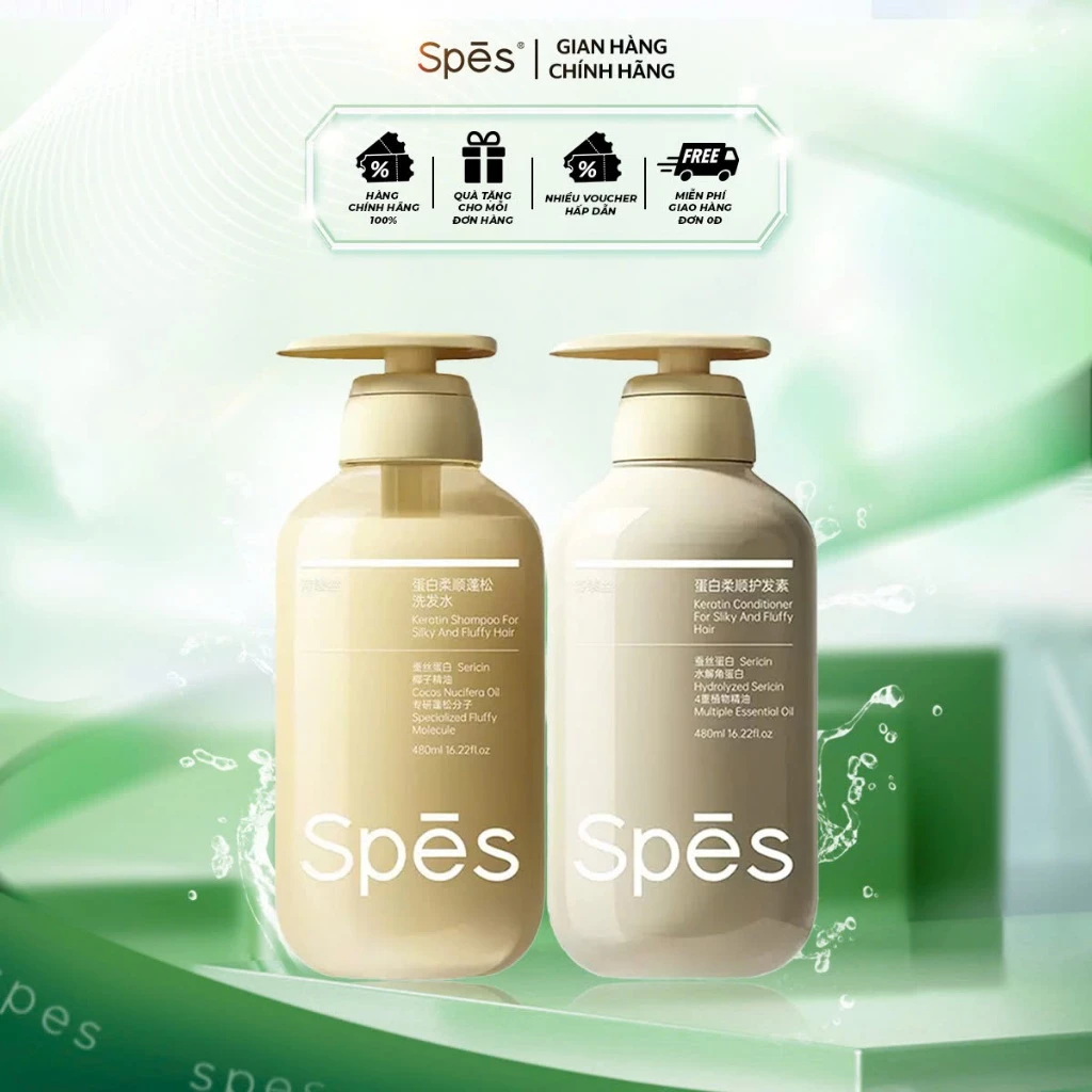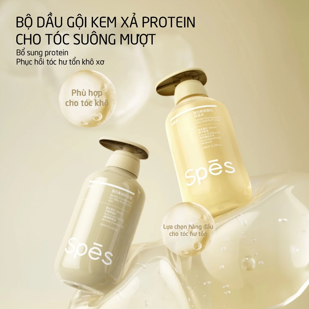 Cặp dầu gội và dầu xả SPES chứa Keratin và Protein là lựa chọn lý tưởng dành cho mái tóc yếu, khô xơ hoặc bị hư tổn do uốn nhuộm. Công thức giàu dưỡng chất giúp phục hồi lớp biểu bì tóc, tăng độ chắc khỏe và cải thiện khả năng đàn hồi của sợi tóc.
