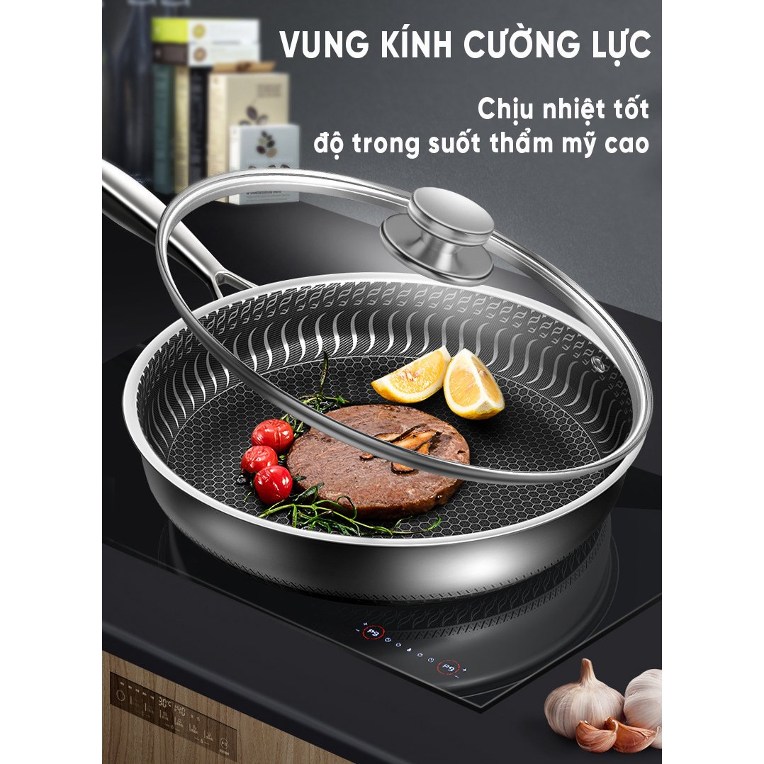 Vung kính cường lực, thiết kế với độ trong suốt cực cao gia tăng sự sang trọng cho chảo Creen. Không tốn dầu ăn, vệ sinh dễ dàng. Sử dụng trên mọi loại bếp.