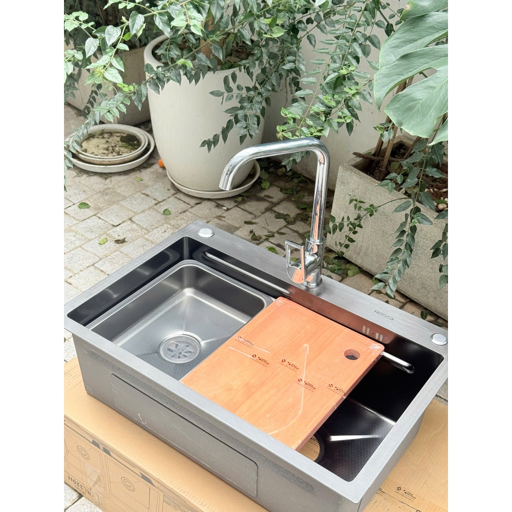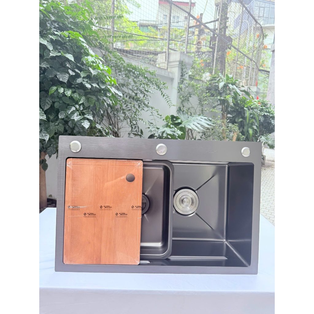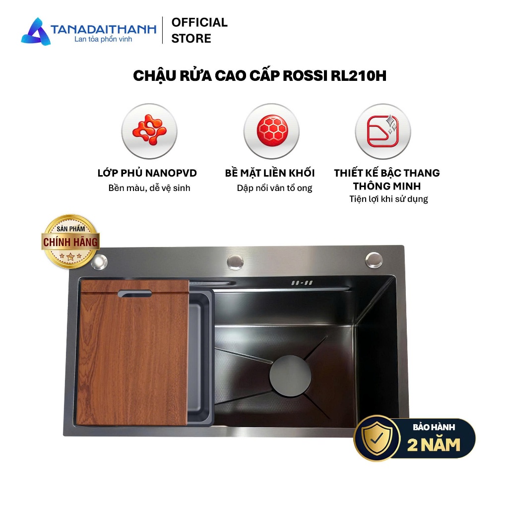 Ngoài ra, chậu rửa còn được phủ lớp mạ Nano giúp chống bám vân tay và dầu mỡ, tăng độ bóng, mang lại vẻ sang trọng cho sản phẩm, giữ độ sáng bóng bền lâu, hạn chế hiện tượng bạc hoặc xỉn màu sau khi sử dụng một thời gian dài. Hơn nữa, lớp phủ mạ Nano PVD còn giúp cho chậu rửa dễ vệ sinh, rút ngắn thời gian dọn dẹp. Thiết kế thông minh Với thiết kế bậc thang 2 tầng, chậu rửa Rossi RL210H giúp chống bắn, tràn nước lên mặt bàn đá. Ngoài ra, các phụ kiện đi kèm gồm khay đựn inox cũng giúp tăng tính tiện lợi trong quá trình sử dụng. Người dùng có thể dùng để thực phẩm, đồ dùng cần rửa lên trên sau khi rửa xong hoặc khi chuẩn bị rửa. Hố chậu sở hữu chiều sâu 220mm cũng giúp hạn chế tình trạng nước bắn tung toé.