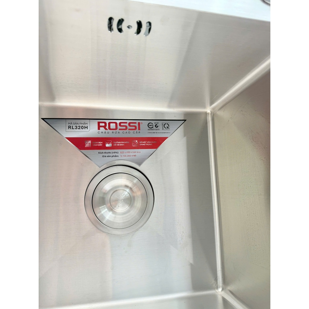 Chậu rửa Rossi RL320H LƯU Ý: CHẬU KHÔNG KÈM VÒI, KHÁCH HÀNG CHỦ ĐỘNG MUA VÒI KÈM CHẬU ĐỂ NHẬN DEAL GIÁ TỐT Được chế tạo từ chất liệu inox SUS 304 cao cấp có độ bền cao, chống ăn mòn, sáng bóng sang trọng kết hợp cùng thiết kế hiện đại, tỉ mỉ trong từng đường nét, chậu rửa cao cấp Rossi RL320H chính là sự lựa chọn hoàn hảo, nâng tầm không gian phòng bếp. Thông số kỹ thuật chậu rửa bát Rossi RL320H Tên sản phẩm: Chậu rửa cao cấp Rossi RL320H Mã sản phẩm: RL320H Kiểu chậu: Chậu rửa 2 hố Chất liệu: Inox SUS 304 Kích thước (Dài x rộng x sâu): 820 x 450 x 230 mm Độ dày: 3.0 x 0.8 mm (3.0 là độ dày của mặt chậu, còn 0.8 là độ dày lòng chậu) Kích thước cắt đá (Dài x rộng): 800 x 430 mm Bảo hành chính hãng: 5 năm Cấu tạo của chậu rửa cao cấp Rossi RL320H Tương tự như những dòng chậu rửa 2 hố khác của thương hiệu Rossi, chậu rửa Rossi RL320H gồm 2 hố chậu có diện tích bằng nhau, được đúc liền nhau và làm từ chất liệu inox SUS 304 cao cấp. Chậu rửa Rossi RL320H có kiểu dáng vuông vức, các mặt trong hố chậu trơn nhẵn mịn. Bề mặt chậu được thiết kế dạng vân xước, tạo nên sự sang trọng. Ưu điểm vượt trội của chậu rửa cao cấp Rossi RL320H Là sản phẩm chậu rửa phân khúc cao cấp thuộc thương hiệu Rossi, chậu rửa Rossi RL320H khẳng định đảm bảo chất lượng từ vật liệu sản xuất cao cấp, thiết kế ấn tượng tới các chứng nhận về chất lượng.