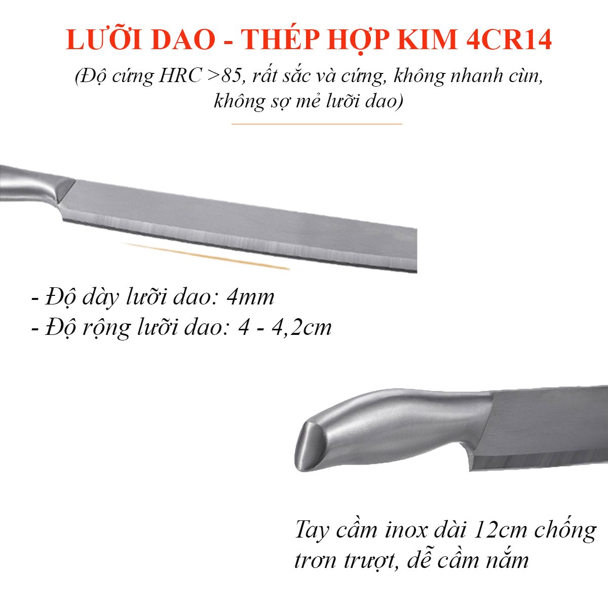 Lưỡi dao dày 4mm , được bào chế từ thép hợp kim 4Cr14 vô cùng sắc bén và cứng, sử dụng bền lâu, không lo sứt mẻ