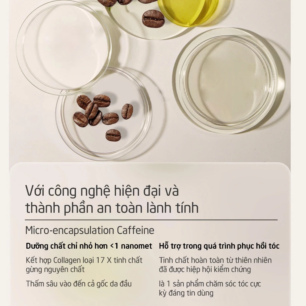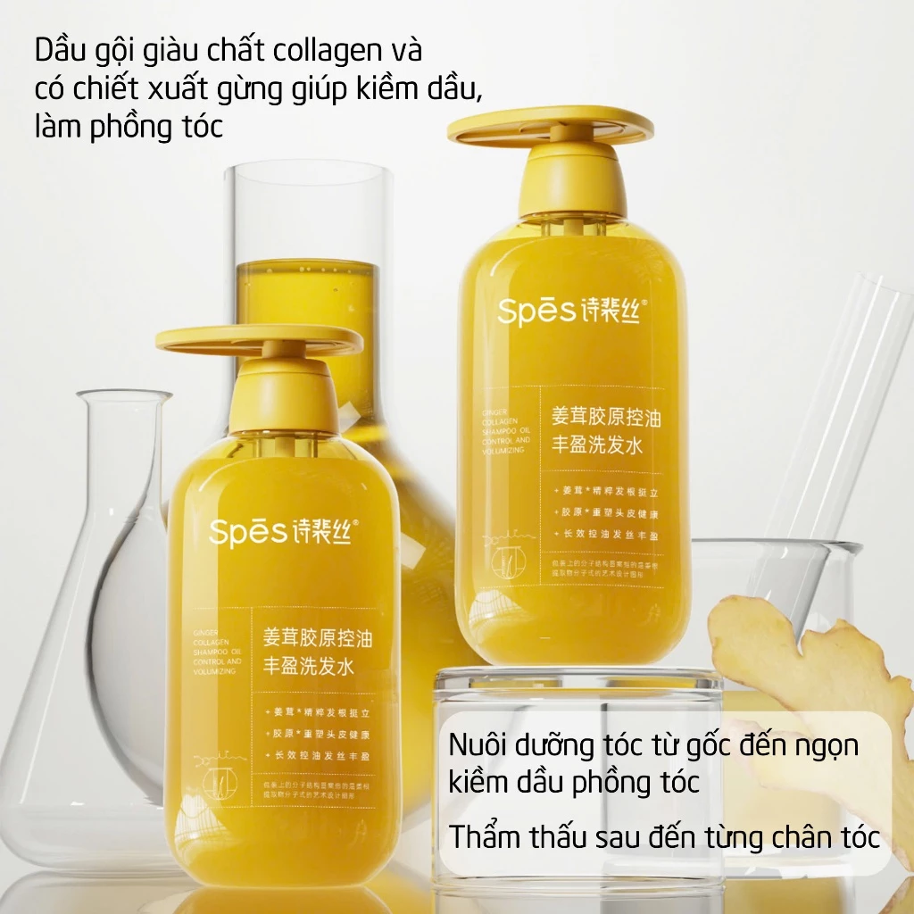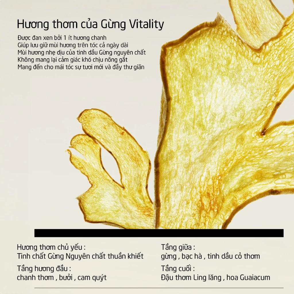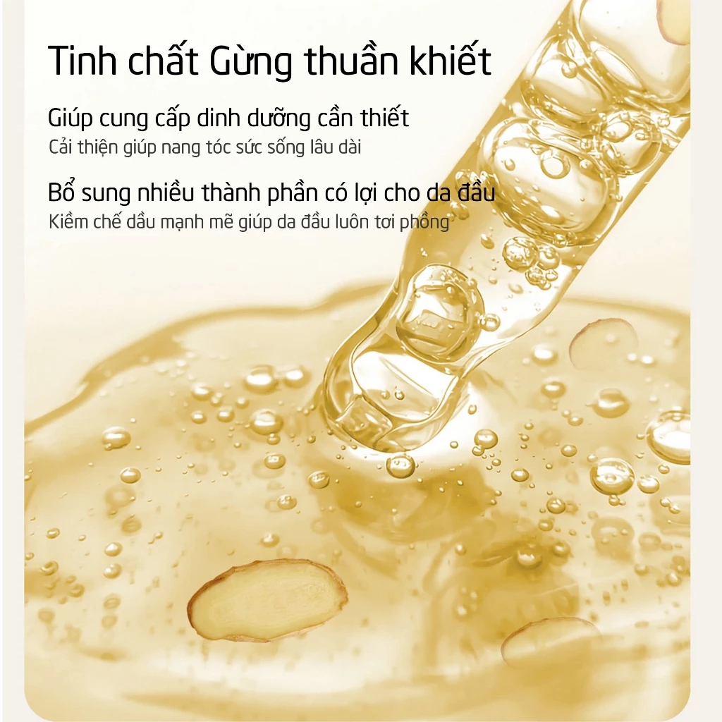 Thành phần chi tiết Chiết xuất gừng thiên nhiên giúp nuôi dưỡng da đầu và giảm rụng tóc Collagen thủy phân giúp phục hồi độ đàn hồi và giảm xơ rối Các chất làm sạch an toàn giúp kiềm dầu nhưng không gây khô Không chứa paraben Không chứa silicone nặng Hương thơm gừng nhẹ và dễ chịu
