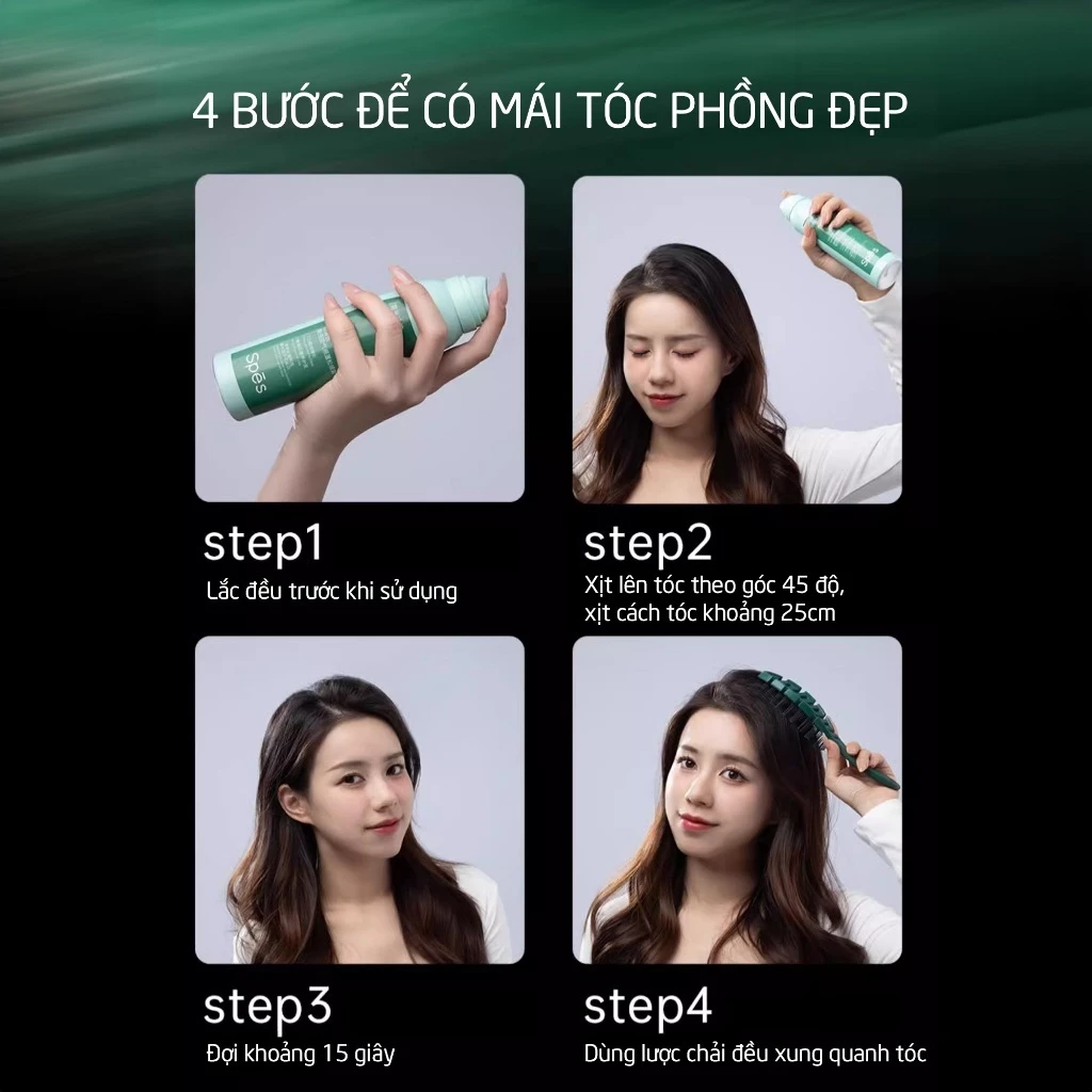 Hướng dẫn sử dụng Lắc đều chai trước khi xịt Giữ chai cách tóc 15 đến 20 cm rồi xịt lên chân tóc Dùng tay massage nhẹ hoặc chải lại để phân tán sản phẩm Đợi 30 giây để bột hút dầu hoàn toàn rồi tạo kiểu tóc theo ý muốn