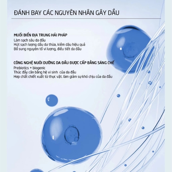 Kiểm soát dầu hiệu quả: Chiết xuất từ muối biển Địa Trung Hải giúp làm sạch sâu bã nhờn, bụi bẩn trên da đầu, cân bằng độ pH, từ đó giảm tiết dầu thừa, giữ cho tóc luôn khô thoáng và sạch sẽ suốt cả ngày.