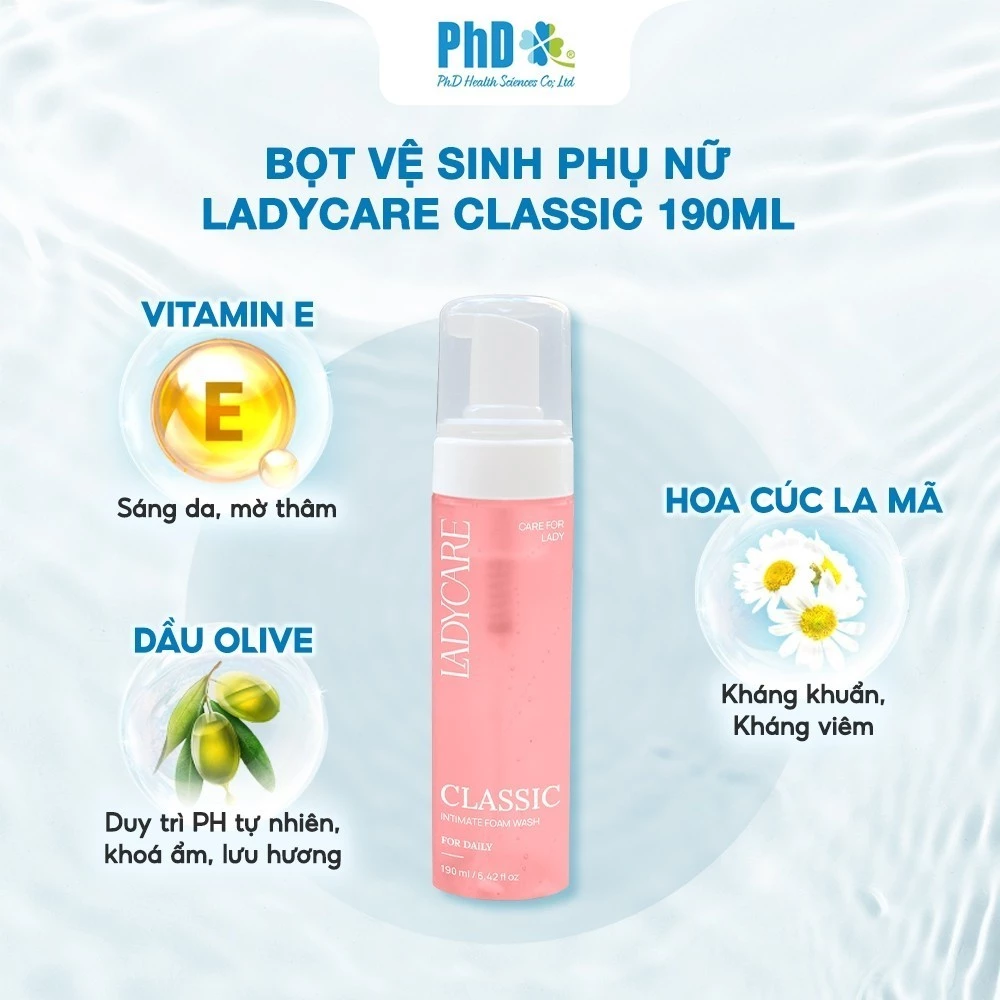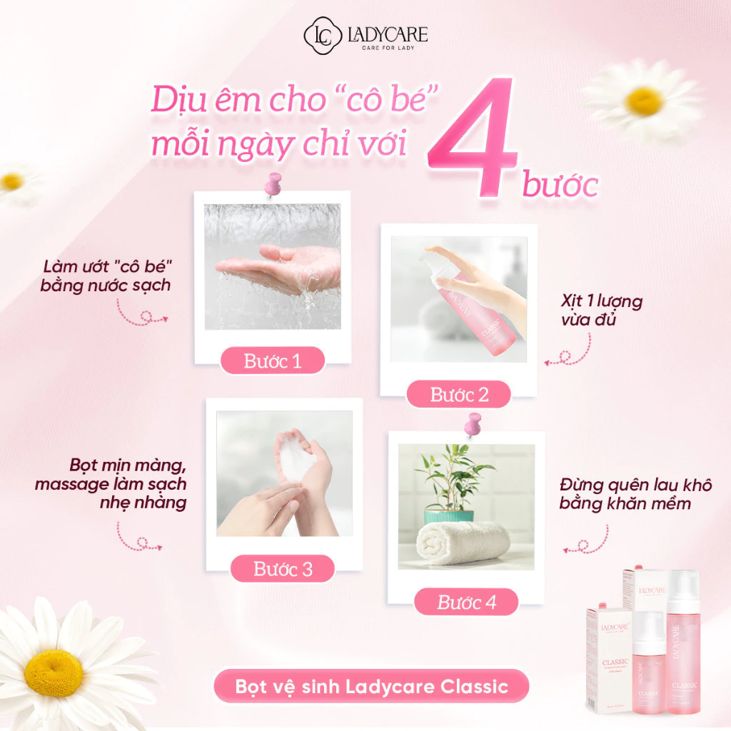 Dung Dịch Vệ Sinh Phụ Nữ Dạng Bọt Ladycare Classic là giải pháp chăm sóc vùng kín hàng ngày, được thiết kế đặc biệt để mang lại cảm giác sạch sẽ, thoáng mát và dễ chịu cho mọi loại da, kể cả làn da nhạy cảm. Sản phẩm có kết cấu dạng bọt mềm mịn, dễ dàng thẩm thấu và làm sạch nhẹ nhàng, giúp loại bỏ bụi bẩn, mồ hôi và các tạp chất mà không gây khô rát hay kích ứng. Công thức cân bằng pH tự nhiên giúp duy trì môi trường lý tưởng cho vùng da nhạy cảm, hỗ trợ bảo vệ hệ vi sinh có lợi, giảm nguy cơ viêm nhiễm và mùi khó chịu.