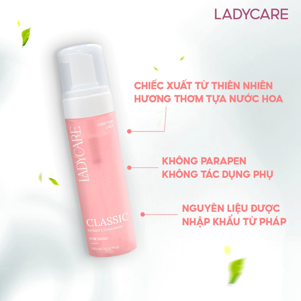 Ladycare Classic chứa các thành phần chiết xuất thiên nhiên an toàn, mang lại hương thơm dịu nhẹ và cảm giác thư giãn mỗi khi sử dụng. Lớp bọt mịn bám đều trên bề mặt da, giúp làm sạch kỹ lưỡng nhưng vẫn giữ lại độ ẩm cần thiết, hạn chế tình trạng khô ráp sau khi rửa. Sản phẩm không chứa xà phòng, paraben hay các chất gây hại, đảm bảo phù hợp để sử dụng hàng ngày.