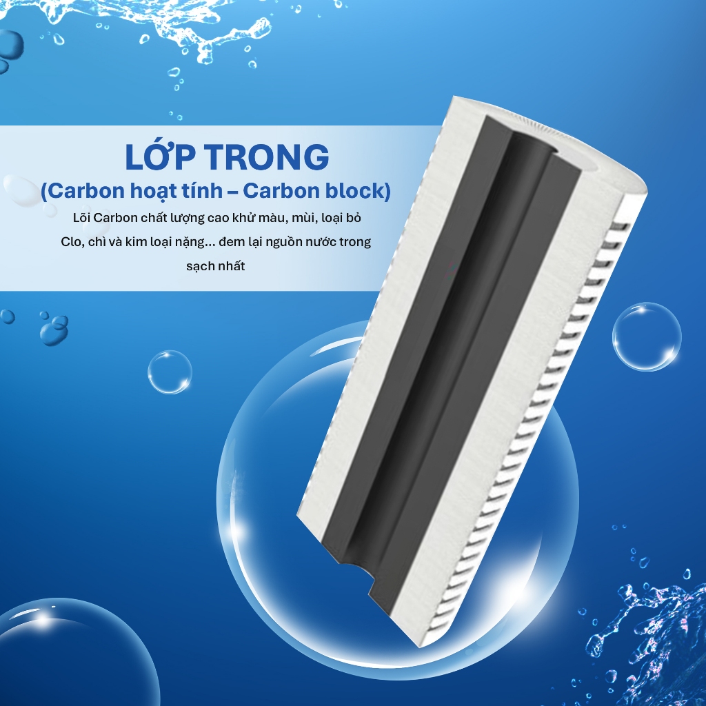 Lớp trong(Carbon hoạt tính – Carbon block): Lõi lọc sử dụng carbon hoạt tính chất lượng cao có chức năng khử màu, mùi, loại bỏ Clo, chì và kim loại nặng… đêm lại nguồn nước trong sạch nhất cho toàn bộ nhu cầu sử dụng nước sinh hoạt trong gia đình.