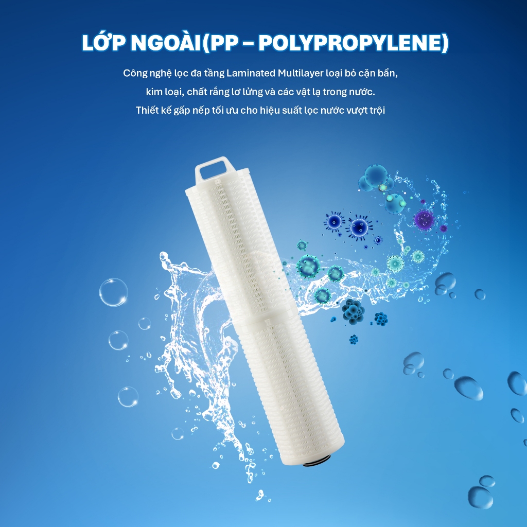 Lớp ngoài(PP – Polypropylene): Sử dụng công nghệ lọc đa tầng Laminated Multilayer có thể loại bỏ cặn bẩn, kim loại, chất rắng lơ lửng và các vật lạ trong nước. Với thiết kế gấp nếp tối ưu diện tích bề mặt, hiệu suất lọc nước của bộ lõi lọc đầu nguồn Tân Á Đại Thành vượt trội hơn hẳn các lõi lọc thô thông thường.