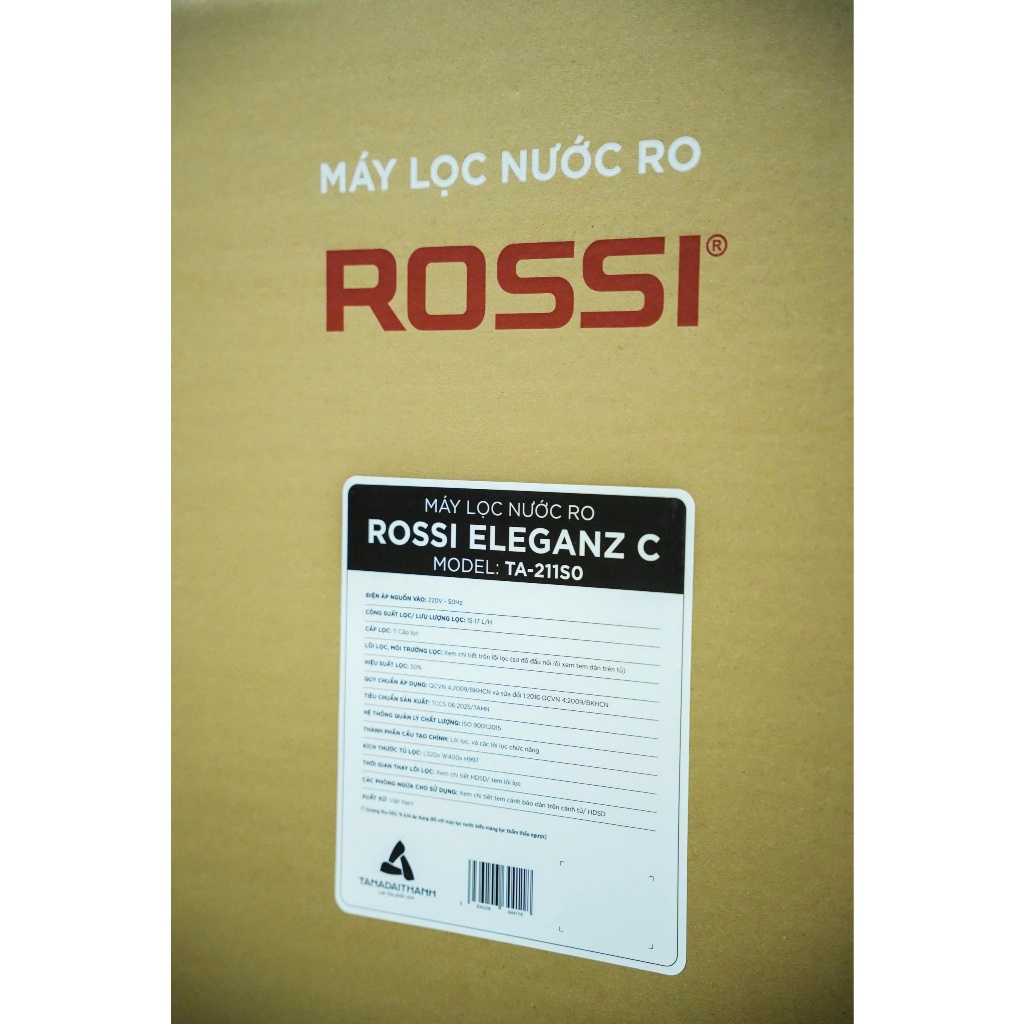 *LƯU Ý: MÁY KHÔNG CÓ NÓNG LẠNH Đặc điểm sản phẩm: Model: TA-211S0 - Máy lọc nước RO tủ đứng sang trọng, phục vụ nhu cầu nước sạch cho gia đình. Bổ sung Hydrogen hàm lượng cao, hỗ trợ cơ thể chống oxy hóa, tốt cho sức khỏe - Bổ sung lõi Hydrogen / Kiềm tạo nước Kiềm tính, nâng cao pH của nước, bổ sung 500 - 600 ppb Hydrogen cho nước giúp cơ thể khỏe mạnh, bù khoáng cho cơ thể giúp trung hòa axit dư, chống oxy hóa, tăng sức đề kháng cho cơ thể - Công nghệ màng RO hiện đại sản xuất tại Hoa Kỳ, mang đến chất lượng nước sạch tuyệt đối, loại bỏ 99.99% vi khuẩn, vi trùng và vi rút gây bệnh, các mùi lạ, mùi khó chịu, hóa chất, tạp chất trong nước - Kiểu dáng sản phẩm sang trọng, đẳng cấp. Phù hợp với mọi không gian nội thất, sản phẩm làm tôn thêm vẻ đẹp của không gian xung quanh. - Thông số kỹ thuật: Loại màng RO và công suất: Màng RO 75 GPD Xuất xứ màng RO: USA Hãng xuất NCC màng RO: Aqualast Tỷ lệ thu hồi nước tinh khiết ( lọc / thải): 50% Công suất lọc của máy: 15 - 17 L/H Lưu lượng vòi: 1.300 - 1.500 ml/p (khi bình áp đầy) Thể thích bình áp: 8,0 Lít Chất liệu bình áp: Bình áp nhựa 3.2G Loại bơm: Tăng áp Công suất điện máy bơm: 36W Bảng điều khiển: Tay vặn trên vòi Số vòi lấy nước: 1 vòi Số khóa vặn lấy nước: 1 khóa vặn Công nghệ in kính: UV, - in đen trắng Chất liệu vỏ tủ: Thép sơn, Kính cường lực, Nhựa Màu sắc: Đen Nhà sản xuất: Rossi Thương hiệu đến từ: Việt Nam Xuất xứ sản phẩm: Việt Nam Năm ra mắt : 2025 Thời gian bảo hành: 24 Tháng Công nghệ lọc: Công nghệ lọc RO