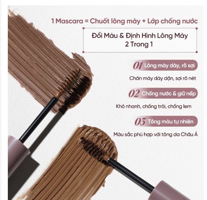 Đầu cọ thiết kế thông minh, vừa vặn, giúp chải đều, tách sợi và định hình dáng mày chuẩn xác chỉ trong vài giây. Khả năng bám màu lâu và chống lem trôi giúp giữ nếp mày ổn định suốt cả ngày, ngay cả trong điều kiện mồ hôi hay da dầu.