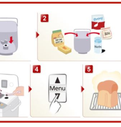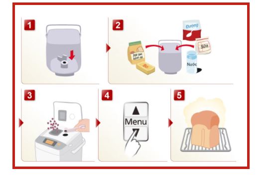 2- Cho bột mì và các nguyên liệu khác vào nồi nướng (Cho theo hướng dẫn của sách hướng dẫn)