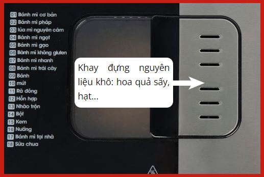 - Máy làm bánh mì Kaisa Villa có 18 chức năng tự động mặc định giúp người mới dùng cực kỳ dễ sử dụng. Do đó, bạn hoàn toàn không phải lo lắng rằng không biết sử dụng máy. Máy được trang bị khay đựng nguyên liệu khô (hoa quả sấy, hạ) riêng biệt và nguyên liệu sẽ được chương trình tự động thả vào công đoạn phù hợp trong quá trình làm bánh mà bạn không mất công canh thời gian để thêm nguyên liệu khô.