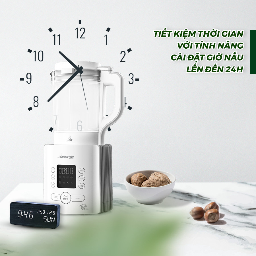 6. TIẾT KIỆM THỜI GIAN VỚI TÍNH NĂNG CÀI ĐẶT TRƯỚC GIỜ XAY NẤU - Máy xay nấu đa năng Dreamer được thiết kế thêm tính năng cài đặt trước thời gian nấu đến 24h, bạn chỉ cần hẹn giờ, chọn chức năng và cho nguyên liệu vào máy. Vào đúng thời điểm được cài đặt, bạn sẽ có ngay những ly sữa hạt cực kỳ thơm ngon, bổ dưỡng.