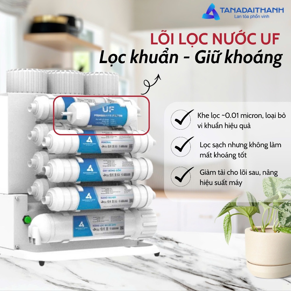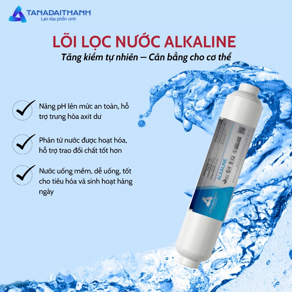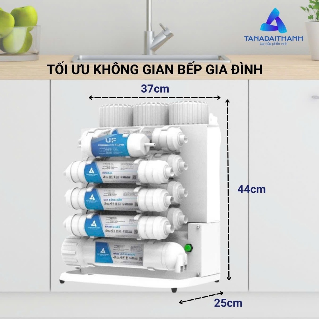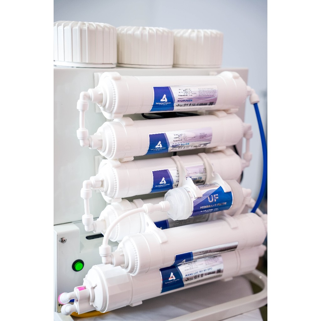 Số lõi lọc: 12 PP5: Lọc các cặn lớn CTO: Khử mùi, khử hóa chất PP1: Lọc tinh các cặn dư thừa Màng RO 75 GPD Aqualast Hydrogen: Tăng lượng Hydrogen trong nước, giúp cơ thể chống oxy hóa Nano Silver: Nano bạc diệt khuẩn giúp chống tái nhiễm khuẩn Than hoạt tính T33: Khử mùi, giúp vị nước ngon hơn Mineral: Bổ sung khoáng chất cho cơ thể Tourmaline: Tạo ion âm có lợi cho cơ thể và giảm các tác nhân có hại trong nước Siêu lọc UF: Giảm vi khuẩn tích tụ đầu vòi Bóng gốm: Hoạt hóa, chia nhỏ phân tử nước, giúp tế bào dễ hấp thụ Alkaline: Làm kiềm hóa, tăng pH cho nước, giúp giảm trình trạng thừa axit Công suất lọc: 15 - 17 L/H (phụ thuộc nguồn nước đầu vào) Điện áp nguồn vào: 220V/50Hz Tiêu chuẩn áp dụng: QCVN 4:2009/BKHCN và sửa đổi 1:2016QCVN 4:2009/BKHCN Tiêu chuẩn sản xuất: TCCS 06:2025/TAHN Hệ thống quản lý chất lượng ISO 9001:2015 Thành phần cấu tạo chính: Lõi lọc và các lõi lọc chức năng Kích thước tủ lọc: L370x W250x H440mm Xuất xứ: Việt Nam